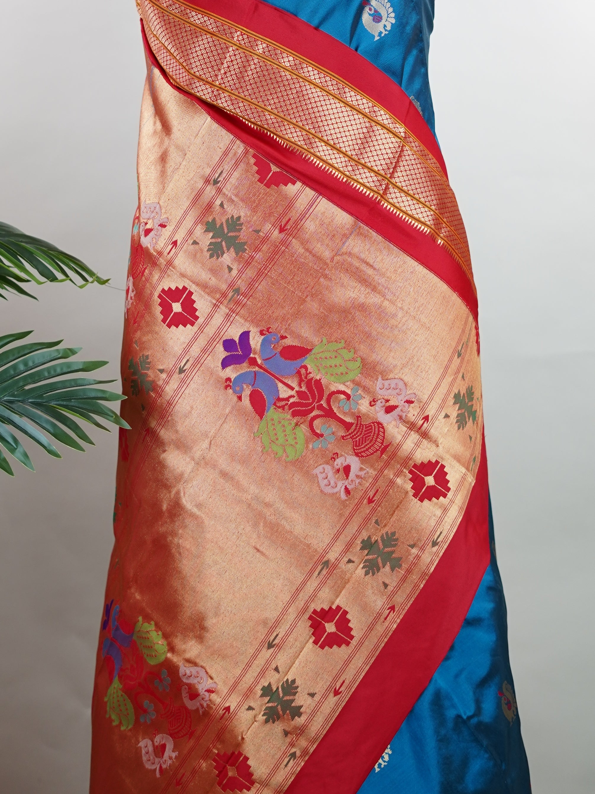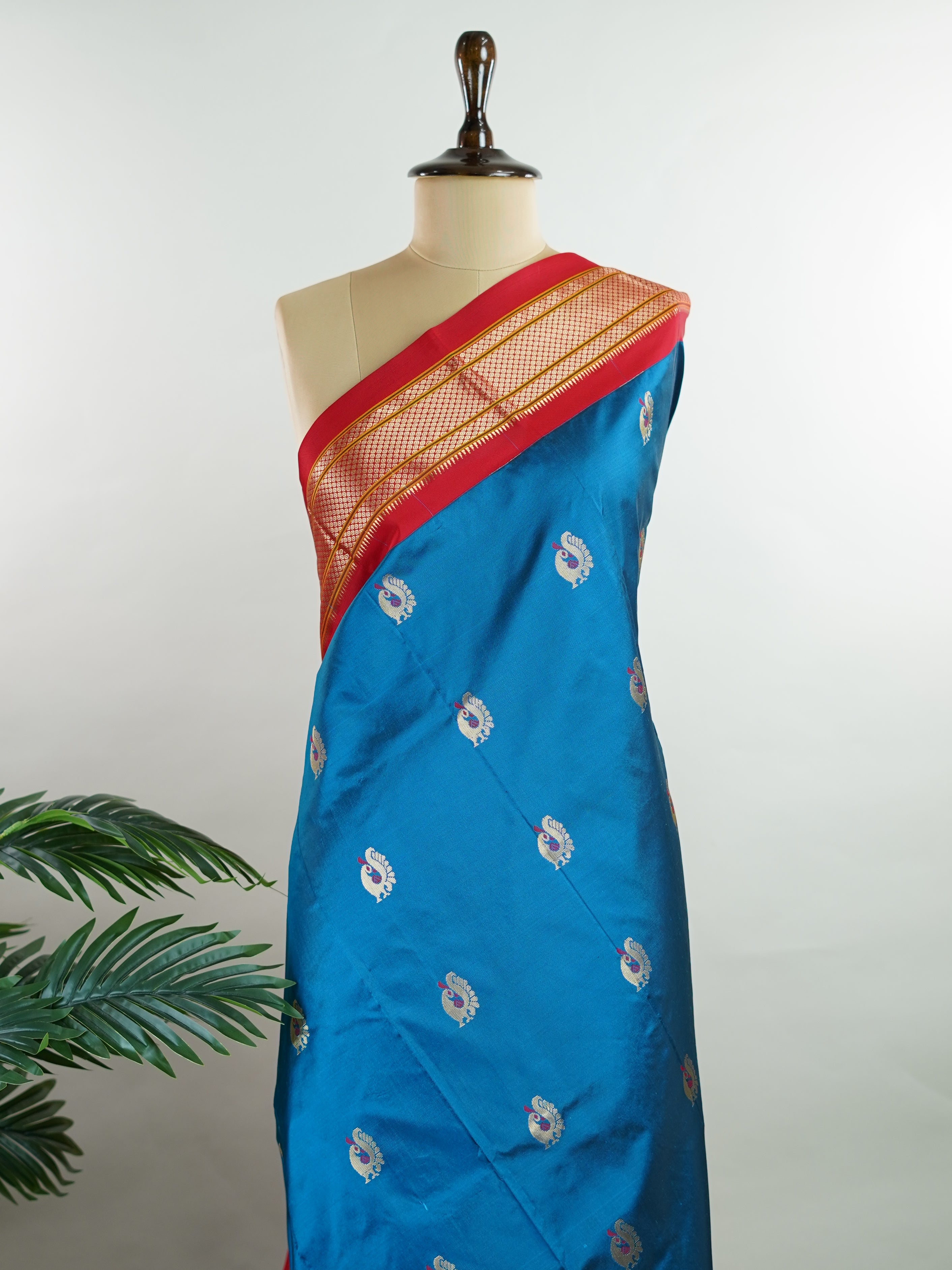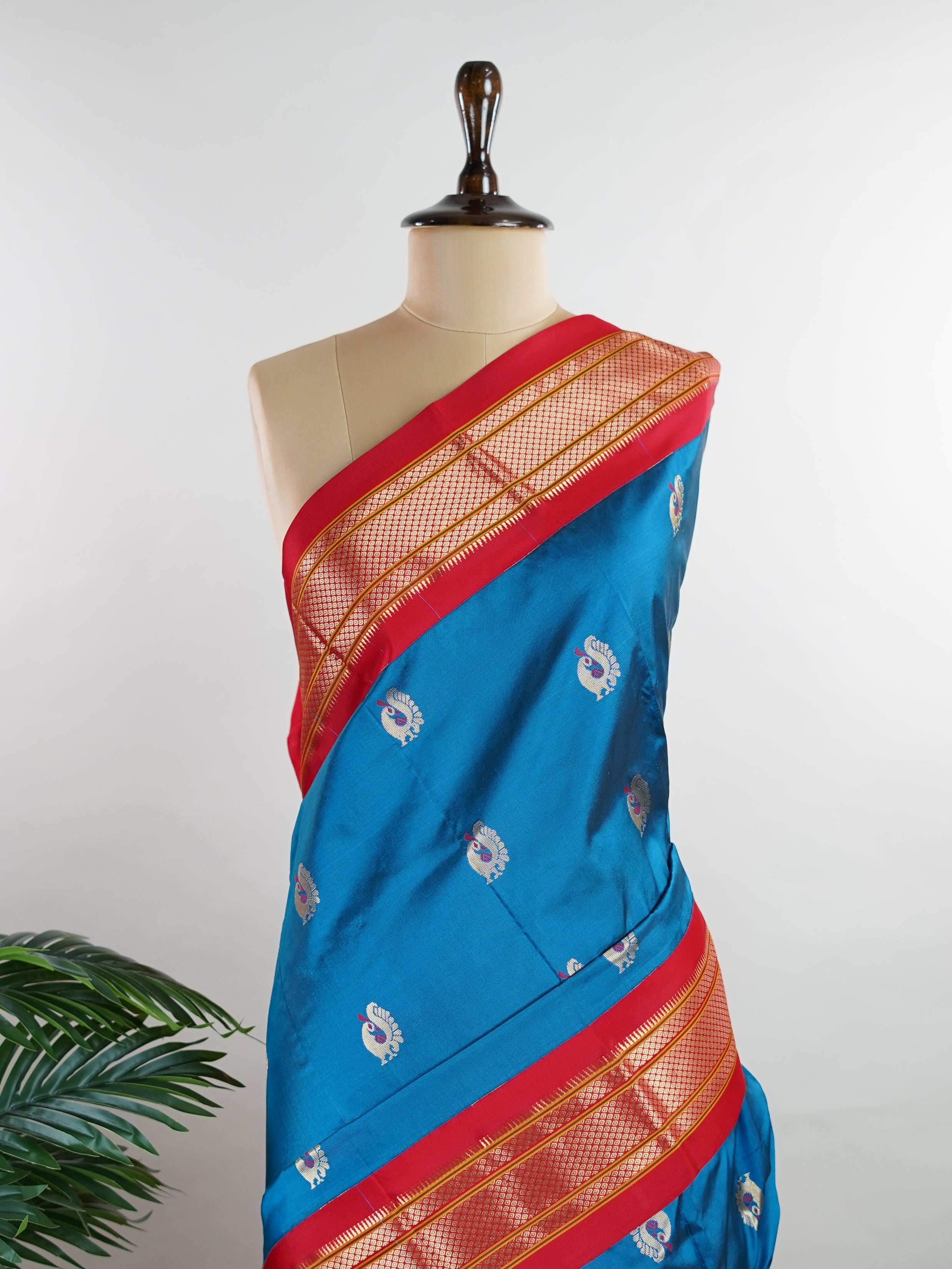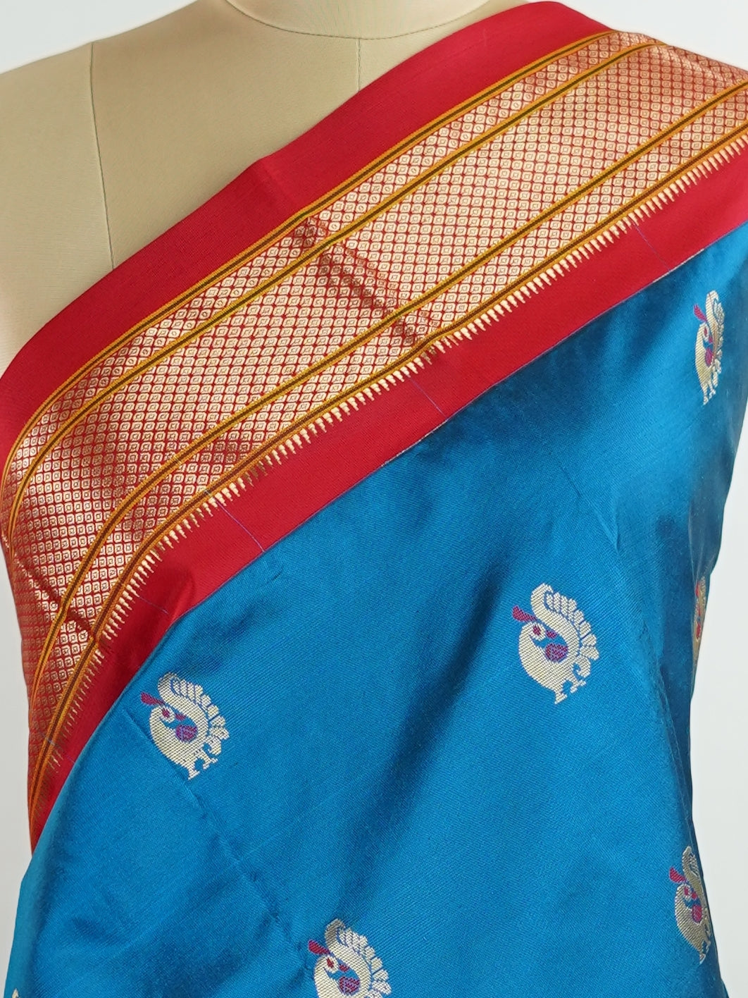 Narayanpet sarees feature elegant plain bodies adorned with delicate buttas, complemented by rich Paithani-style pallus.