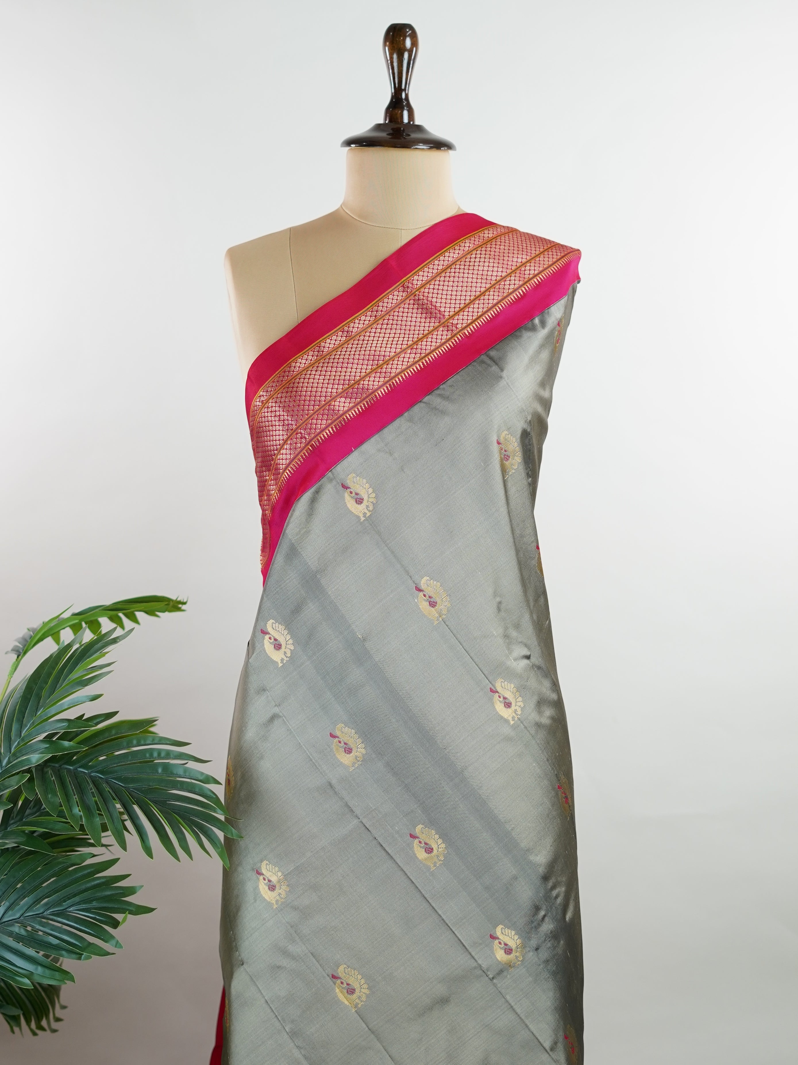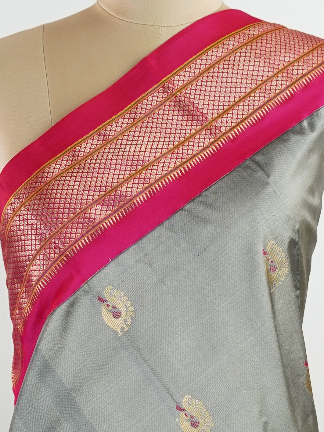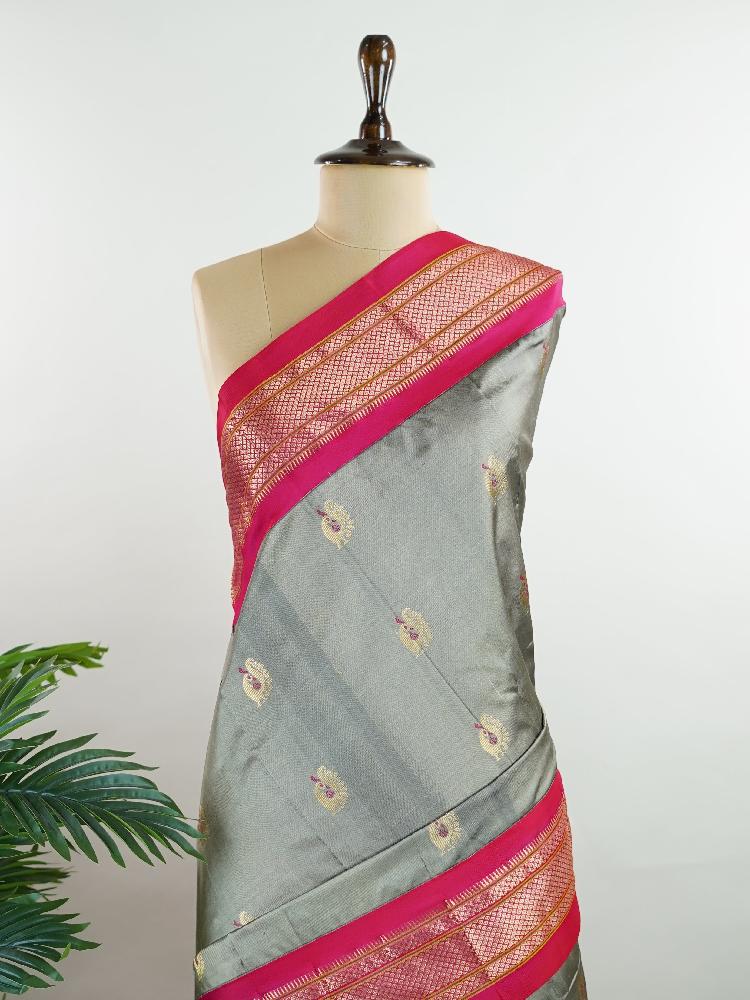 Narayanpet sarees feature elegant plain bodies adorned with delicate buttas, complemented by rich Paithani-style pallus.