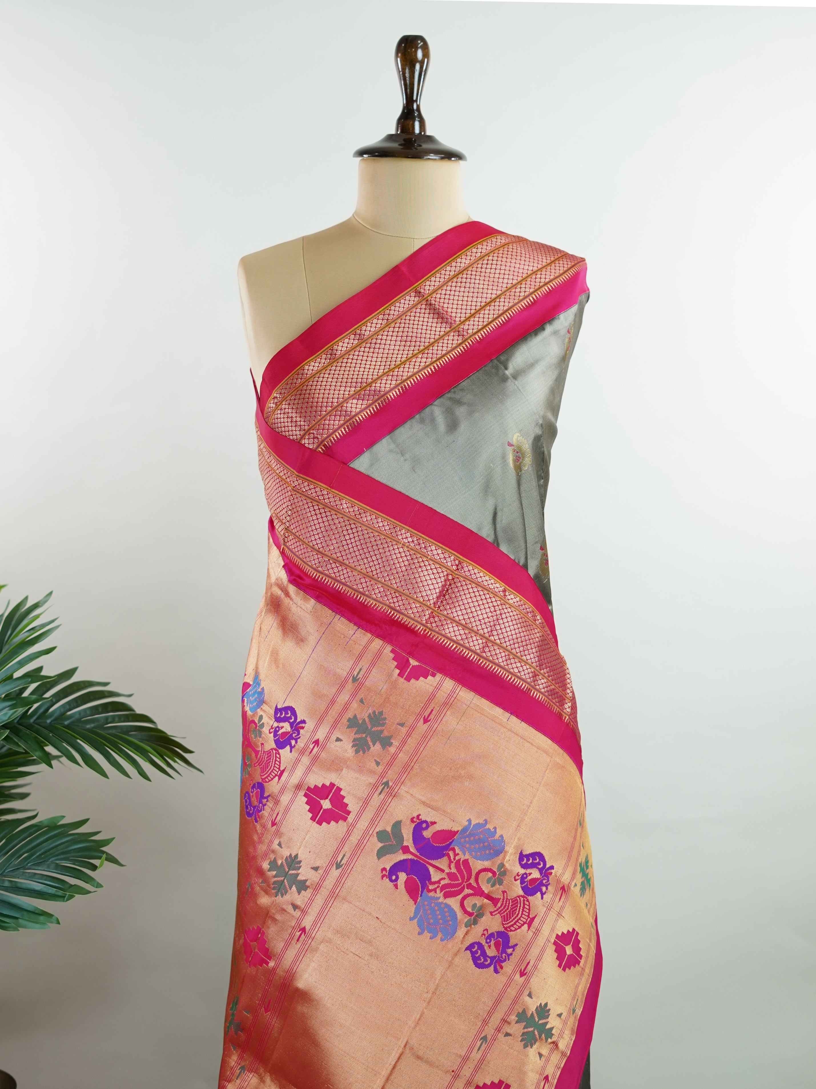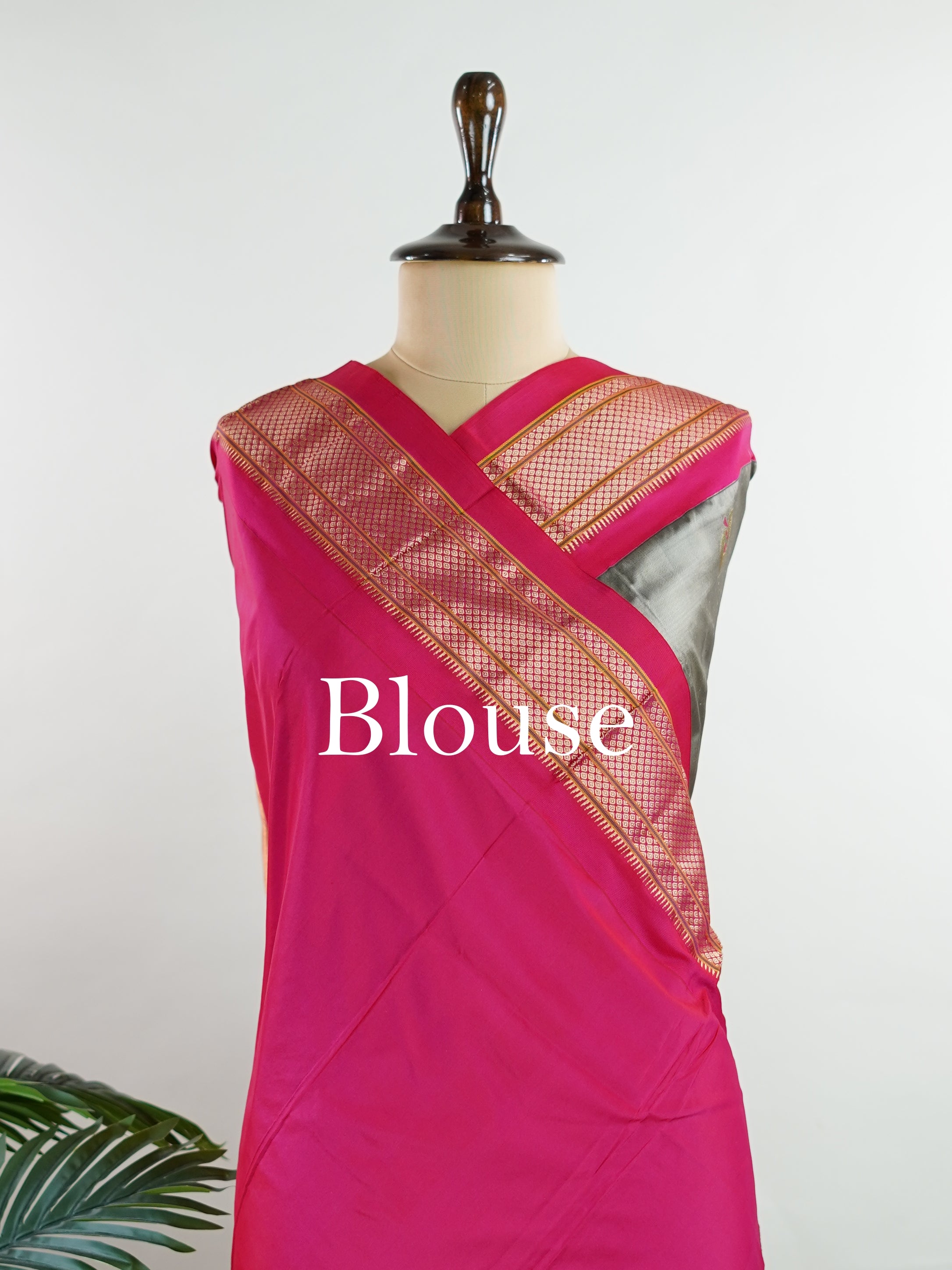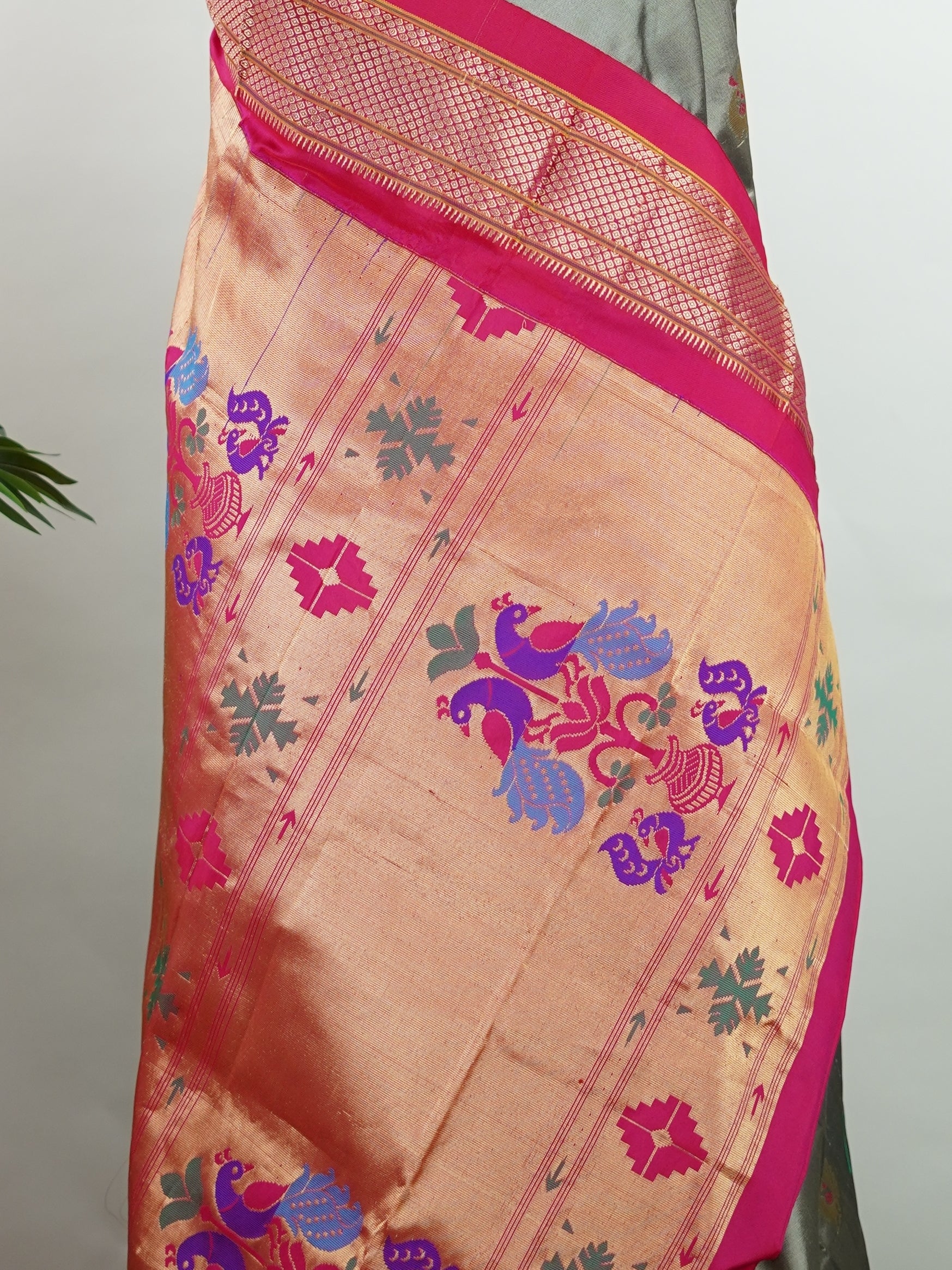 Narayanpet sarees feature elegant plain bodies adorned with delicate buttas, complemented by rich Paithani-style pallus.