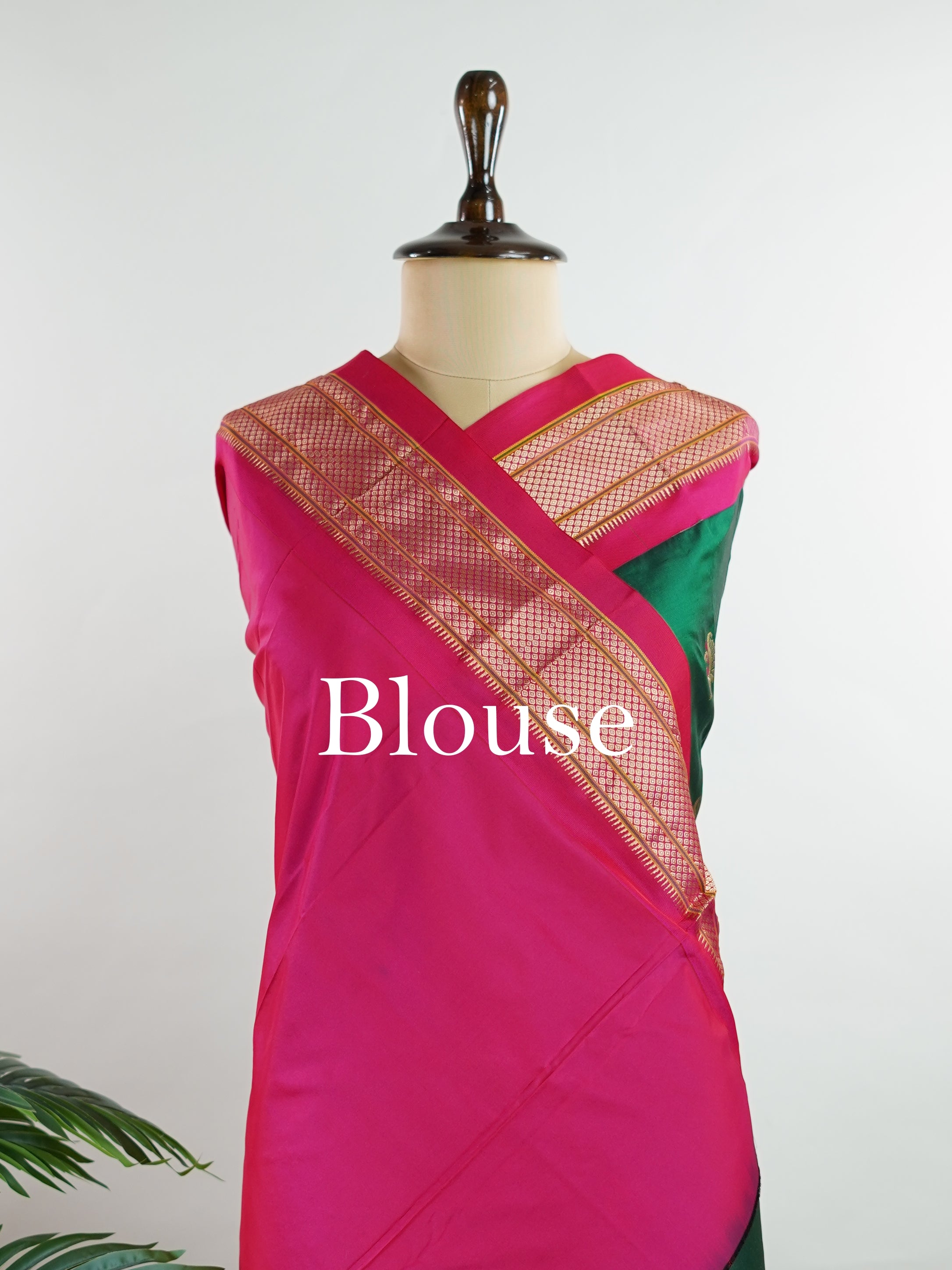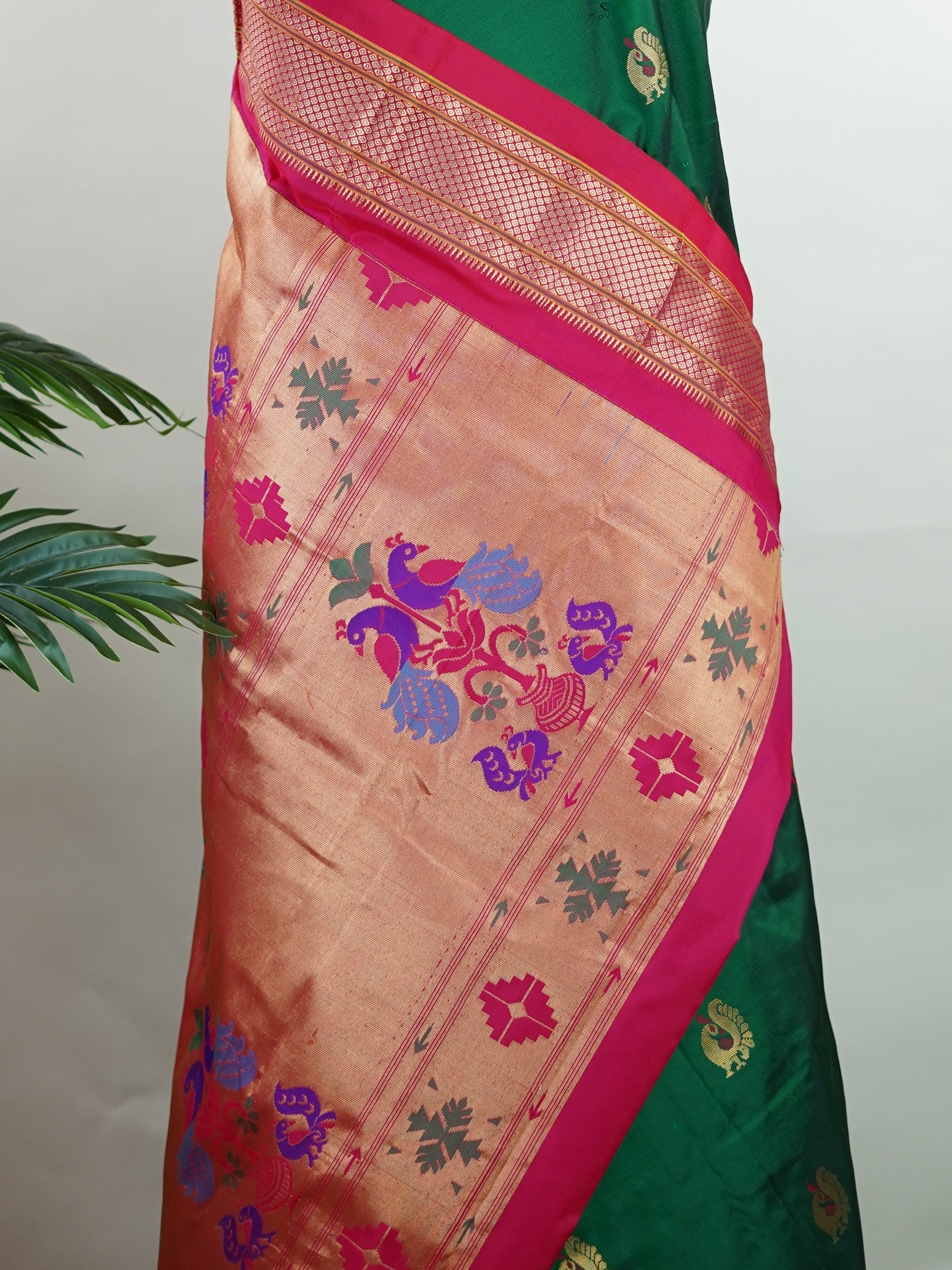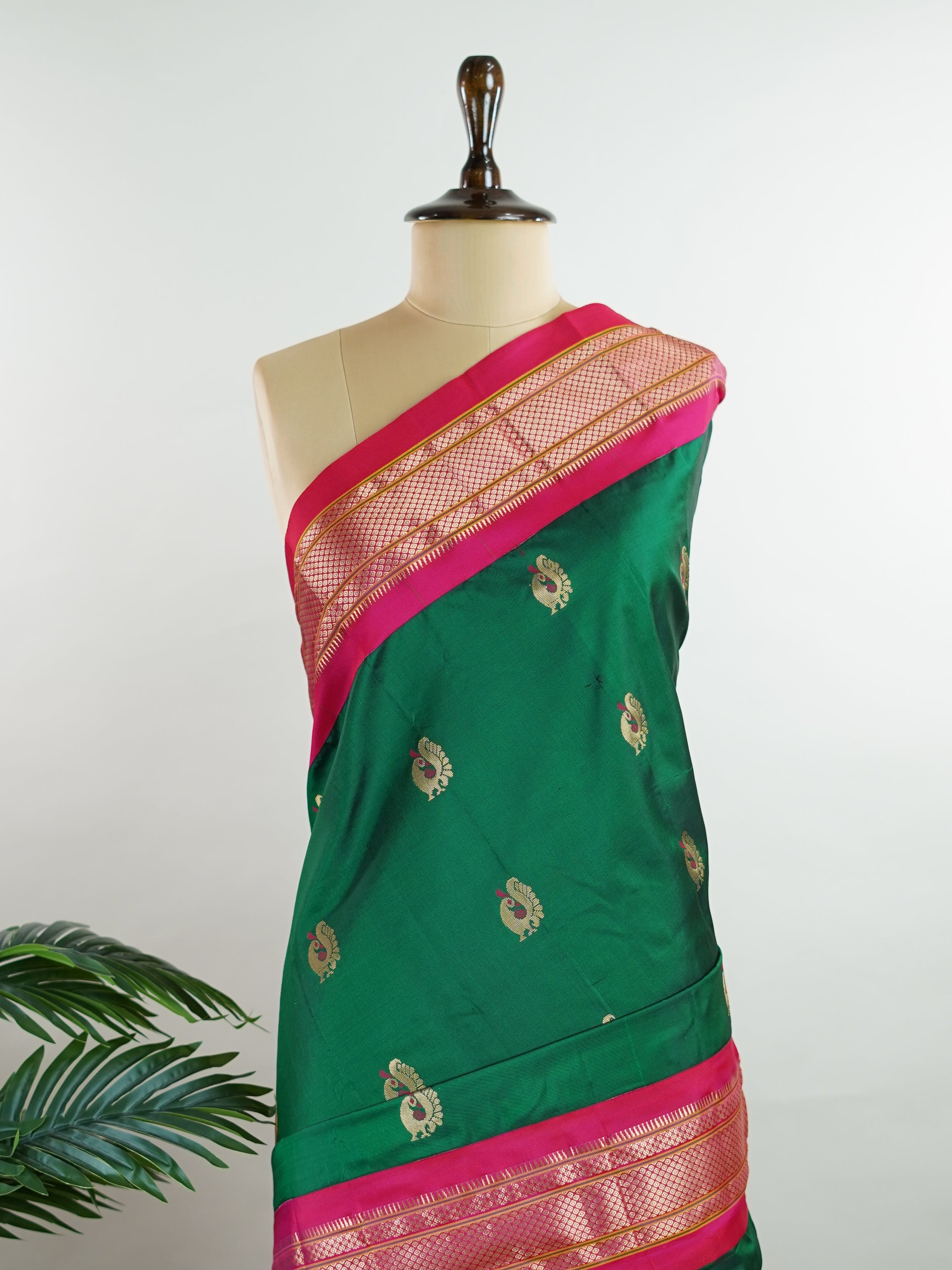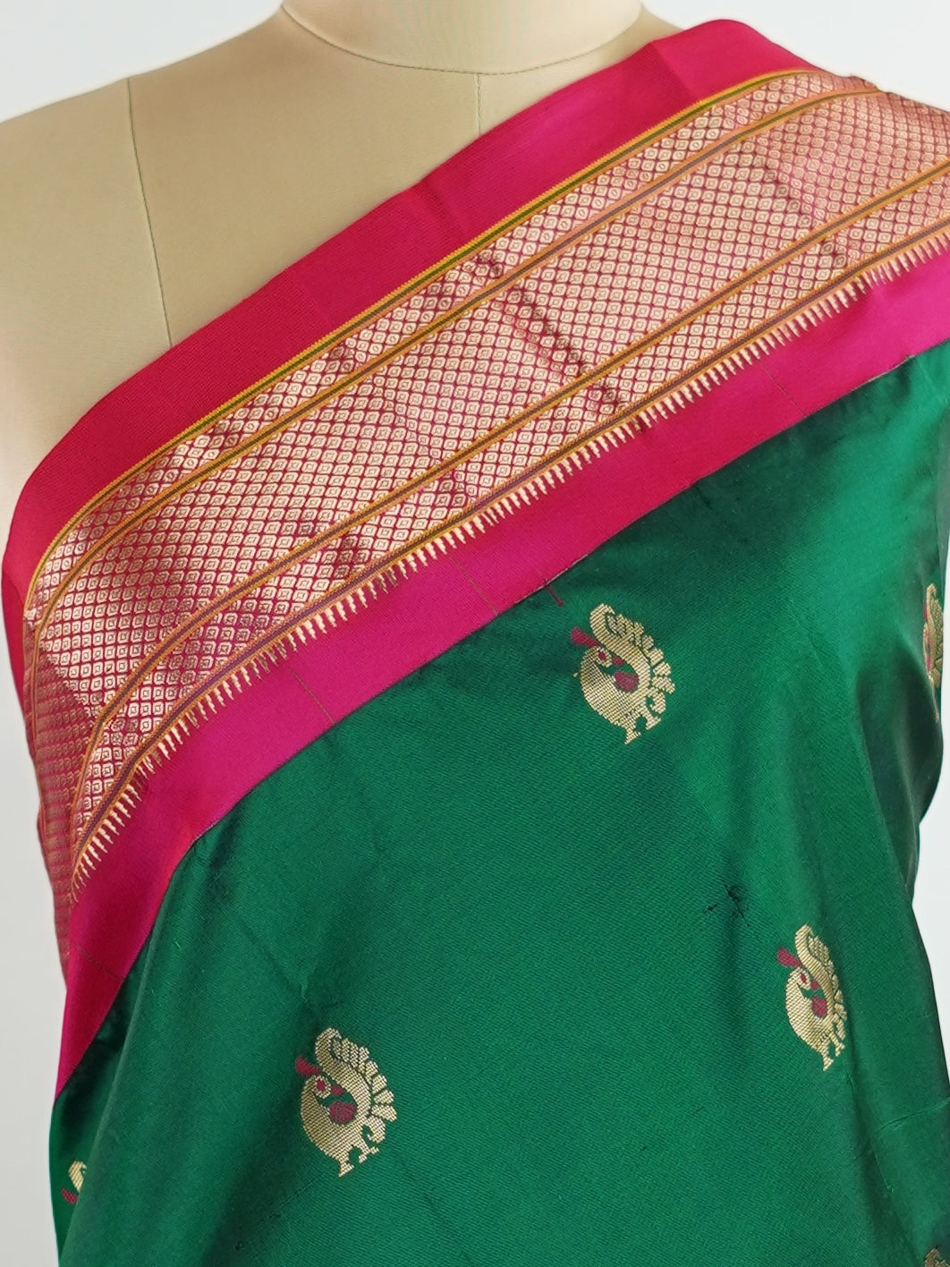 Narayanpet sarees feature elegant plain bodies adorned with delicate buttas, complemented by rich Paithani-style pallus.