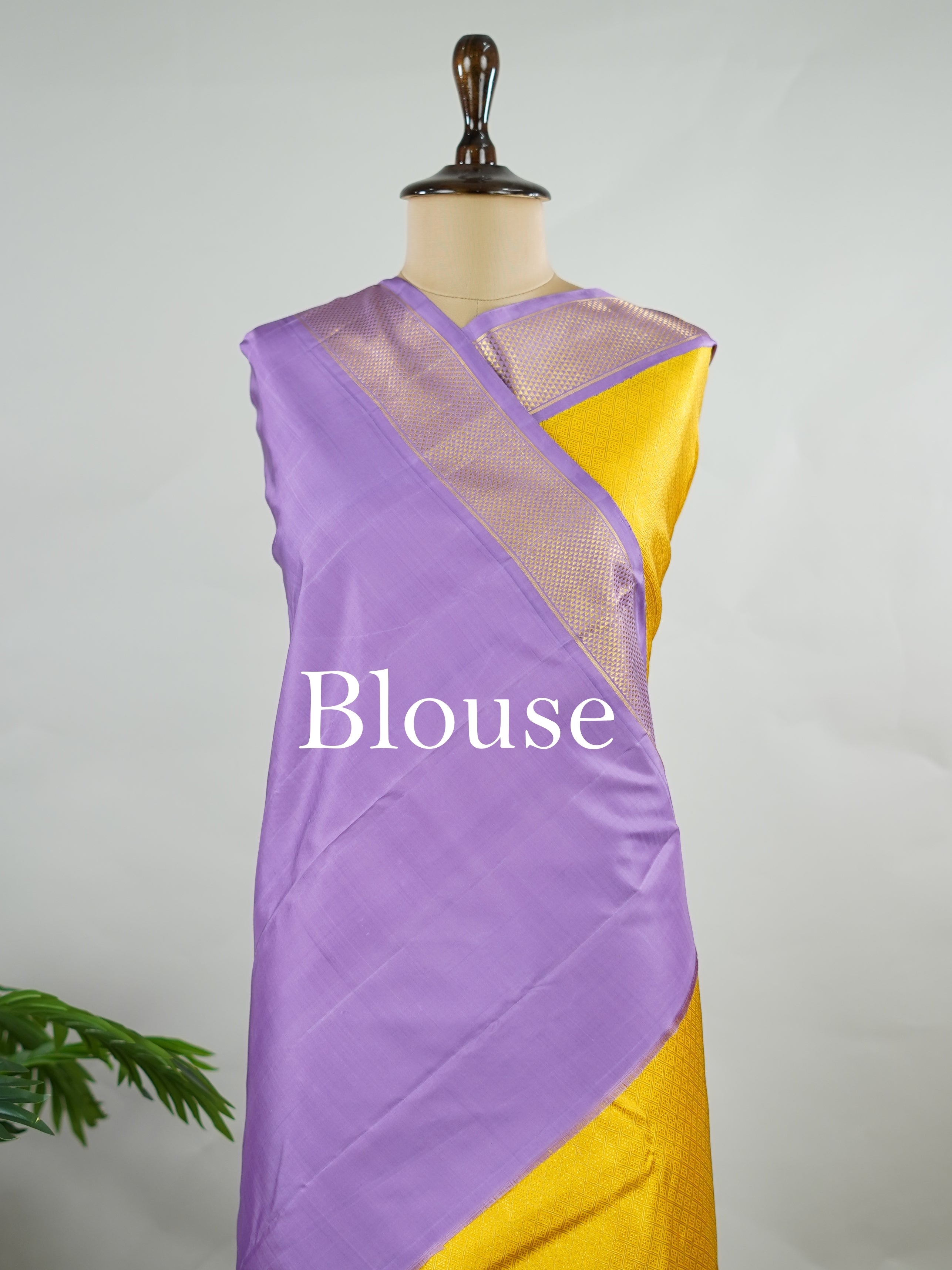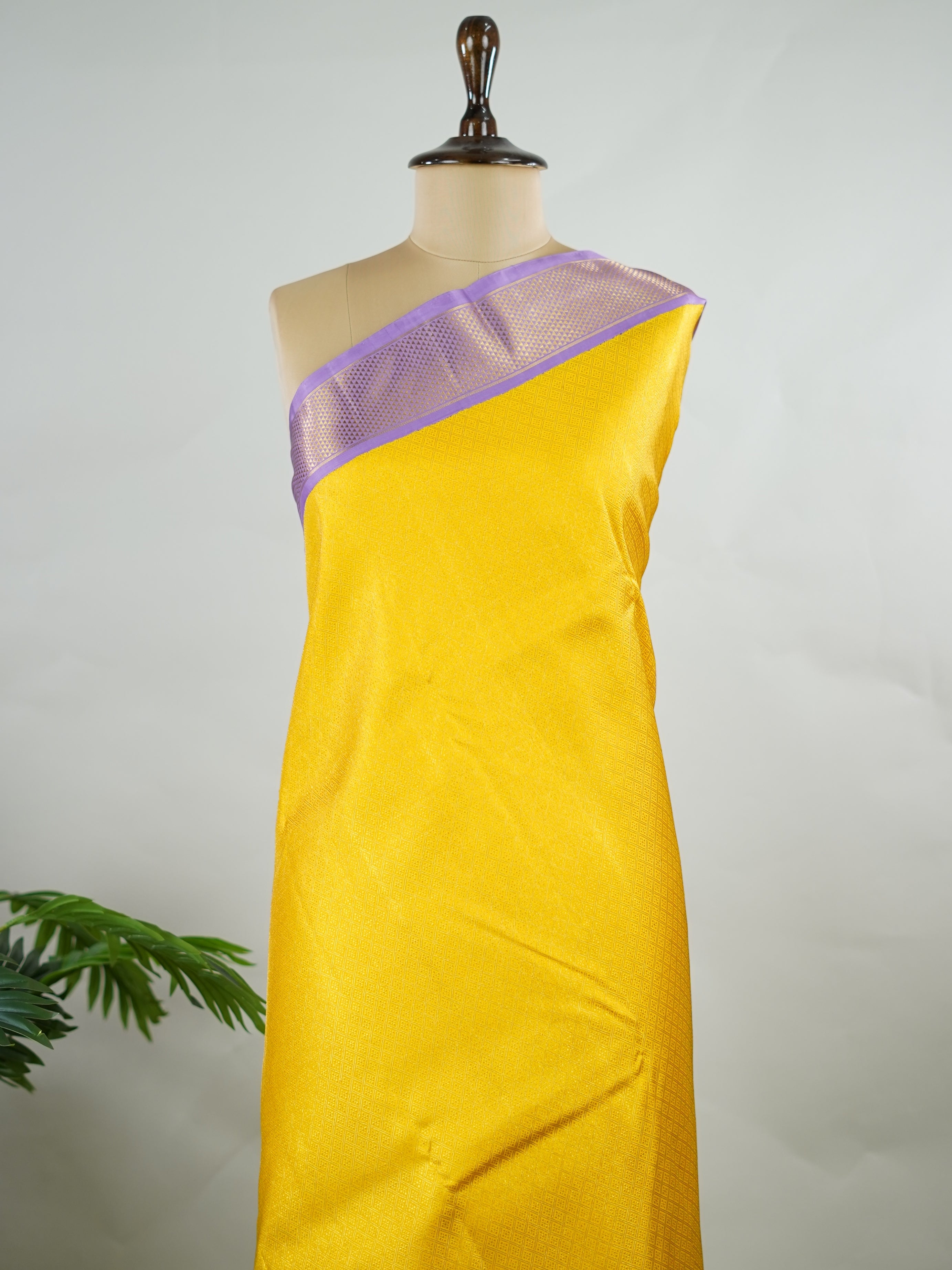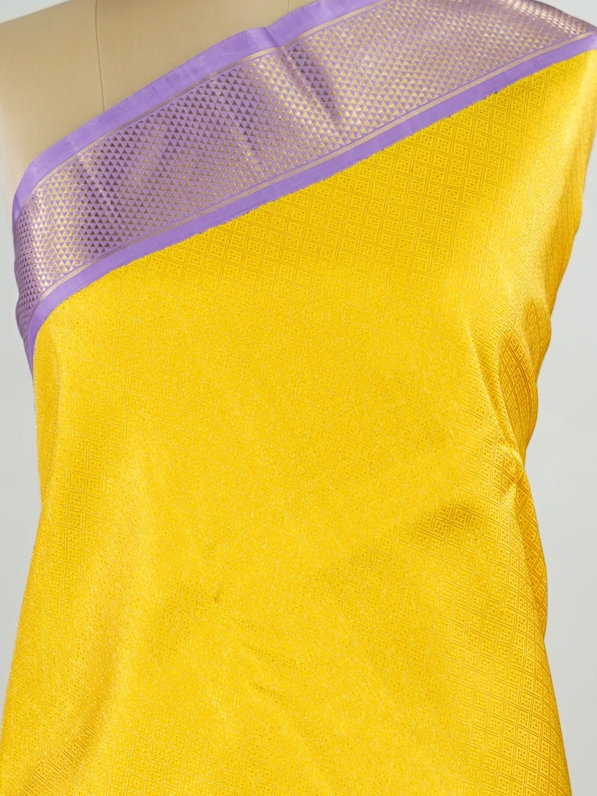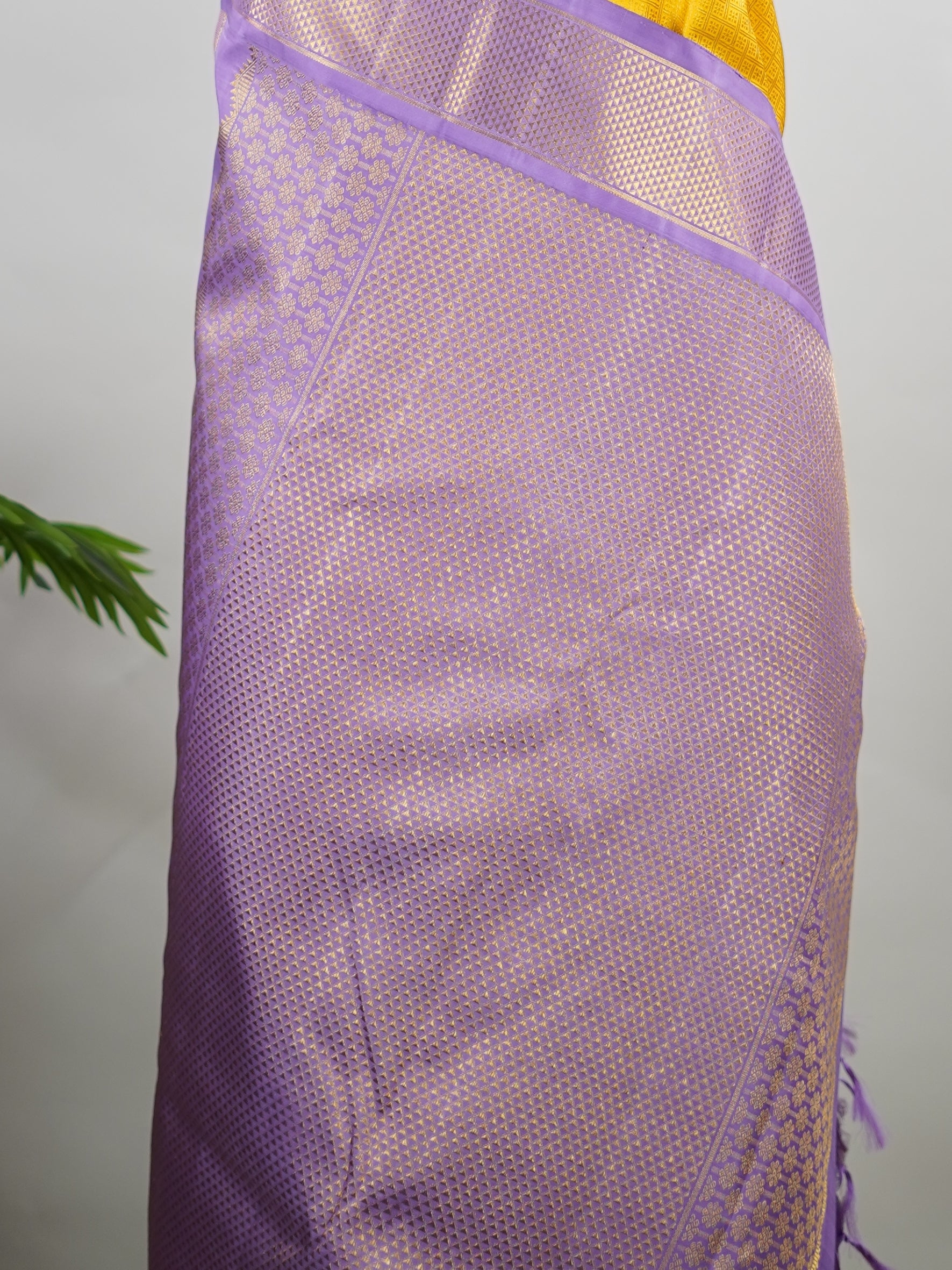 Yellow brocade Kanjivaram body paired with a delicate lavender kaddi border.