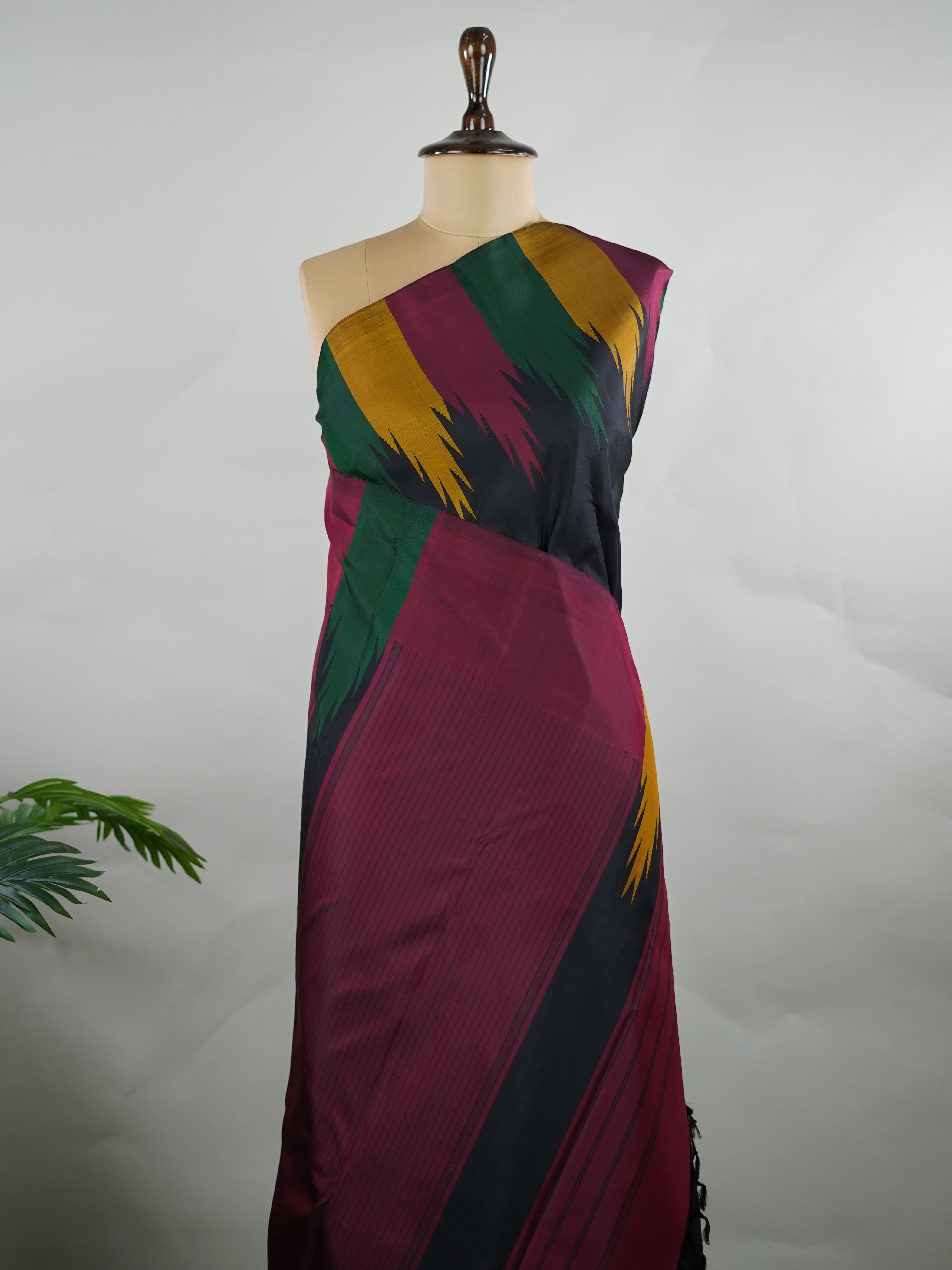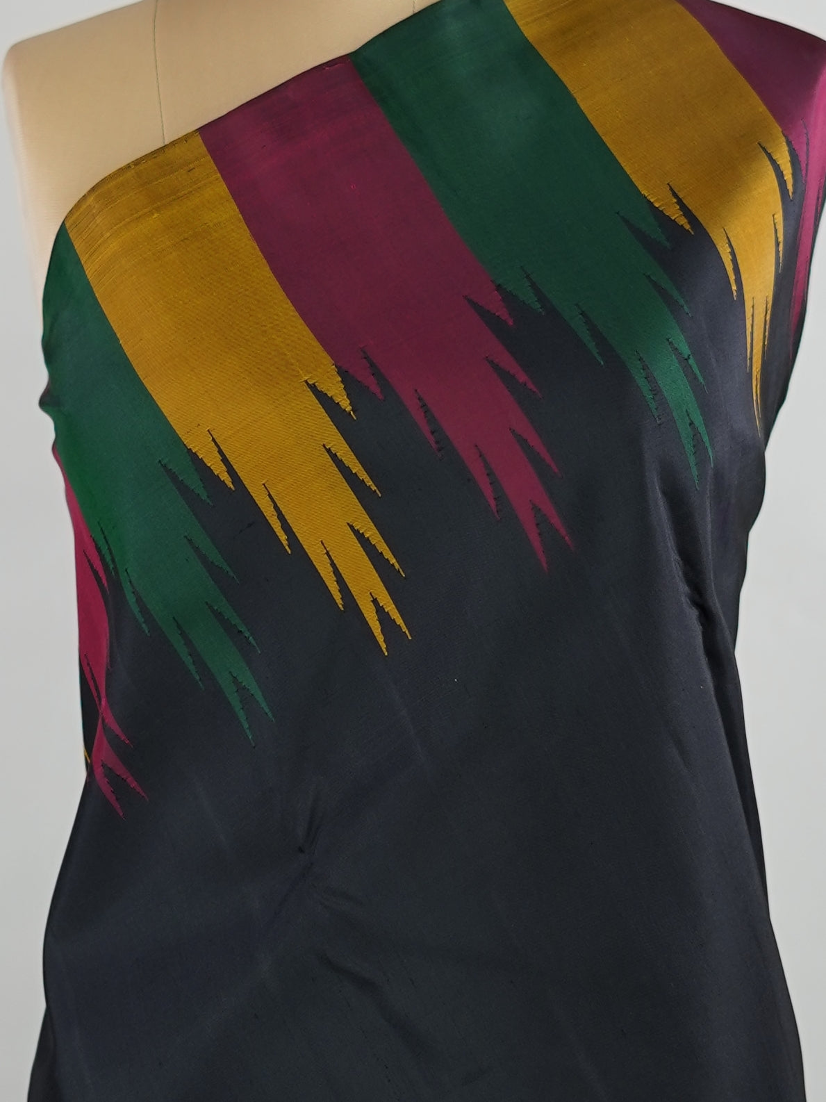 Woven in pure Kanjivaram silk, this saree pairs a deep black body with a rich maroon pallu and matching blouse. The multi temple borders add a subtle rhythm of tradition, lending depth without overpowering the design. A classic composition that speaks through contrast, craftsmanship, and timeless elegance.
