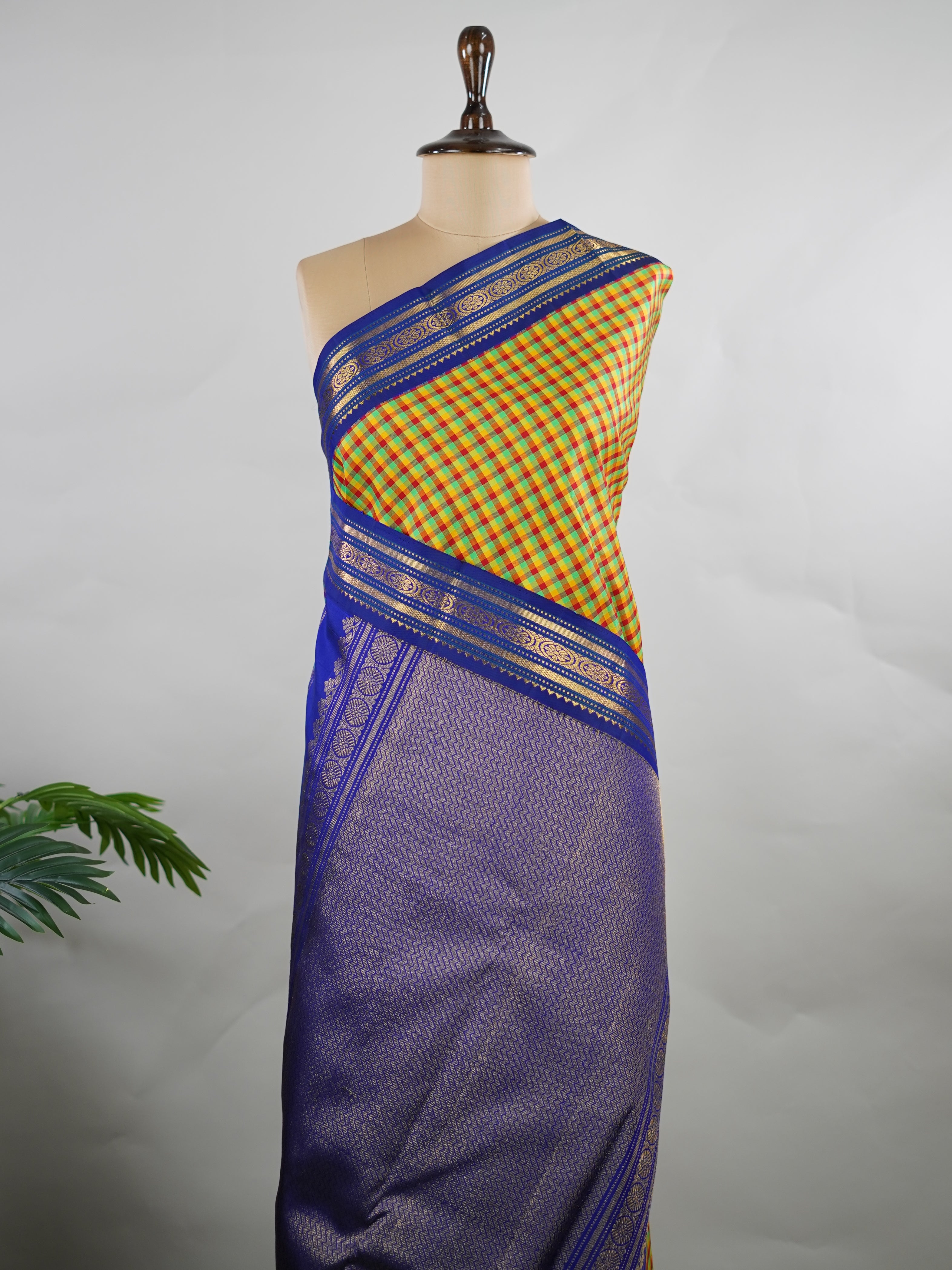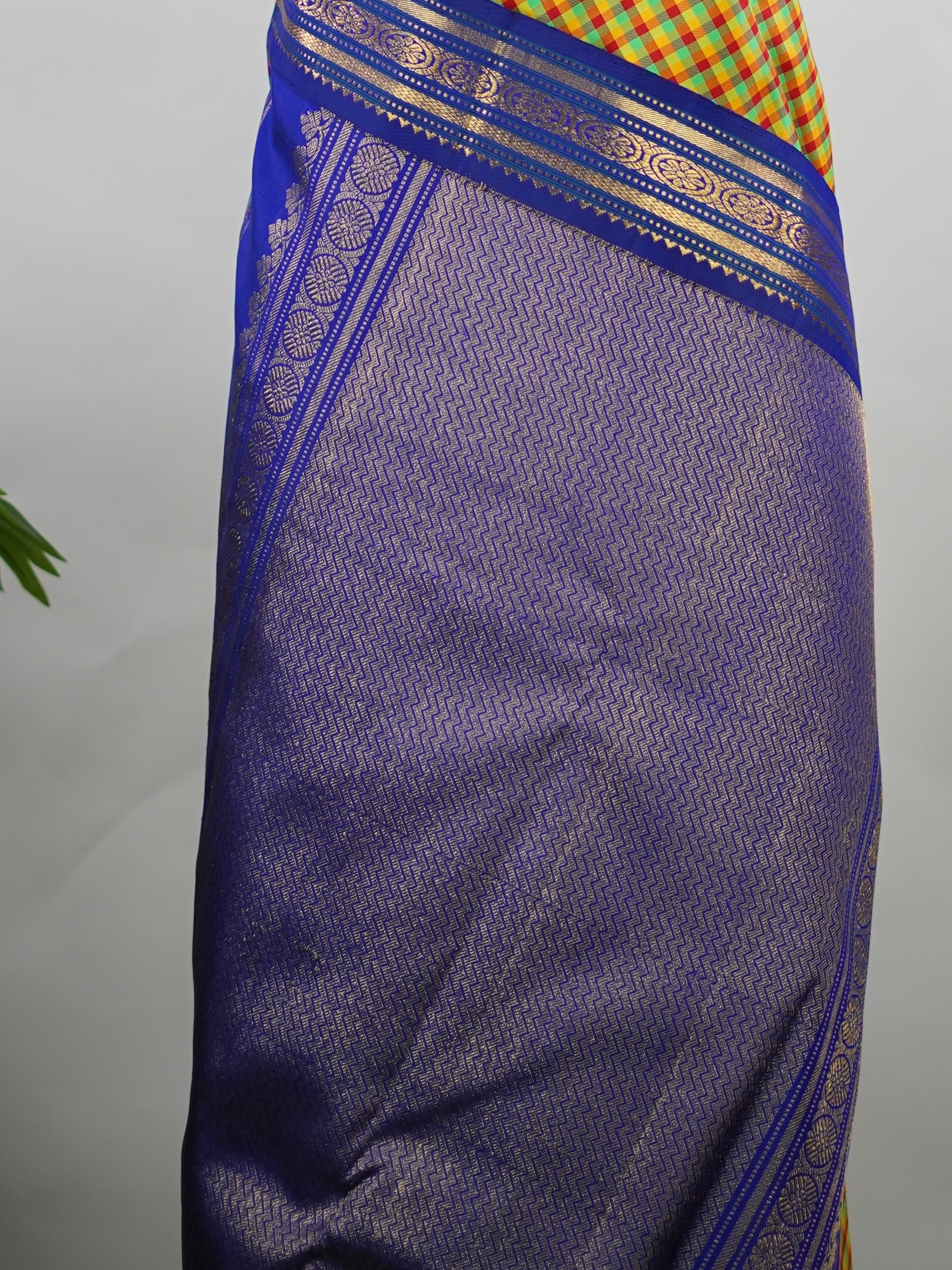 Accented with a traditional blue korvai (kuttu) border.