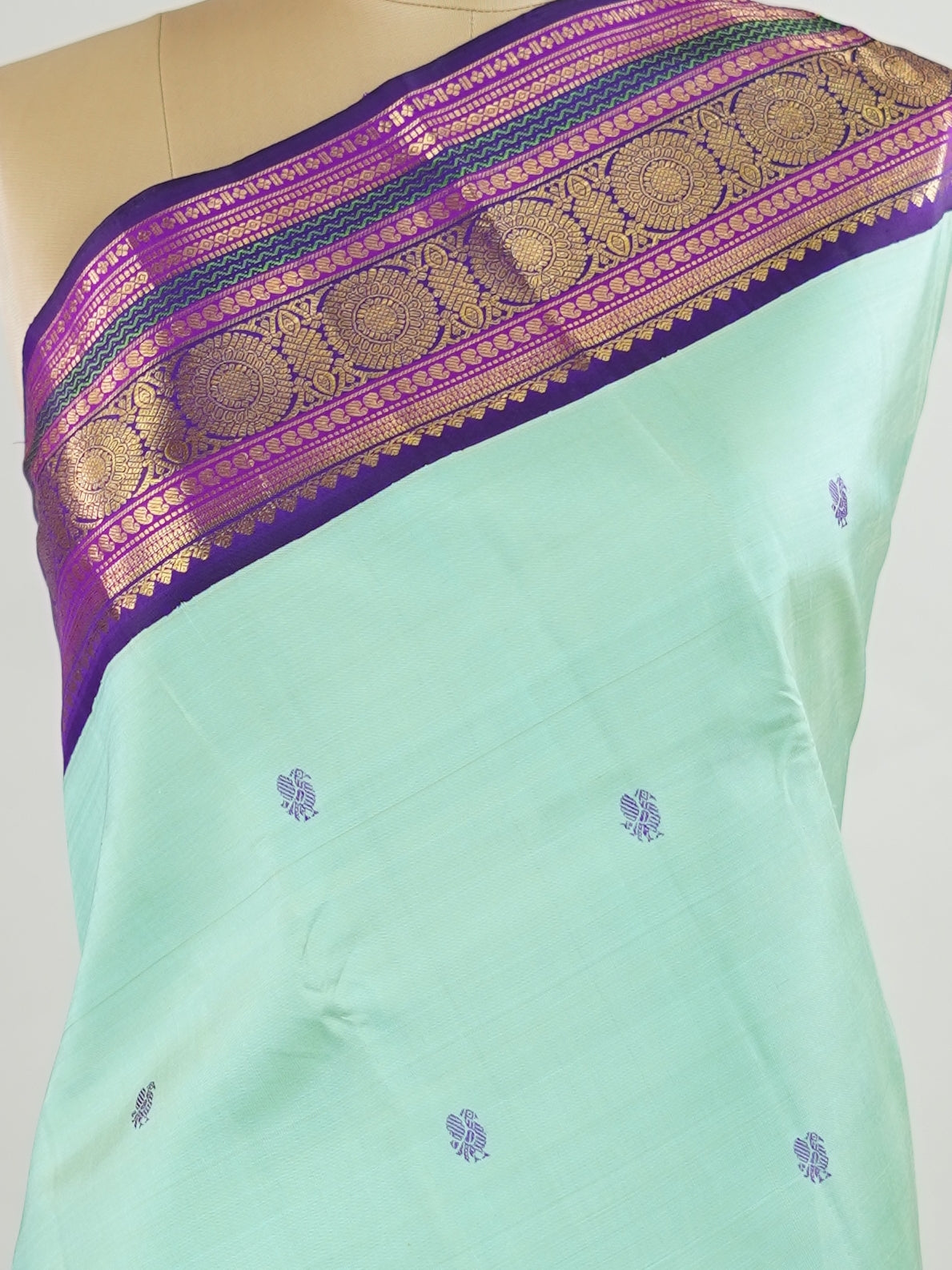 Paired with a rich purple border and pallu.