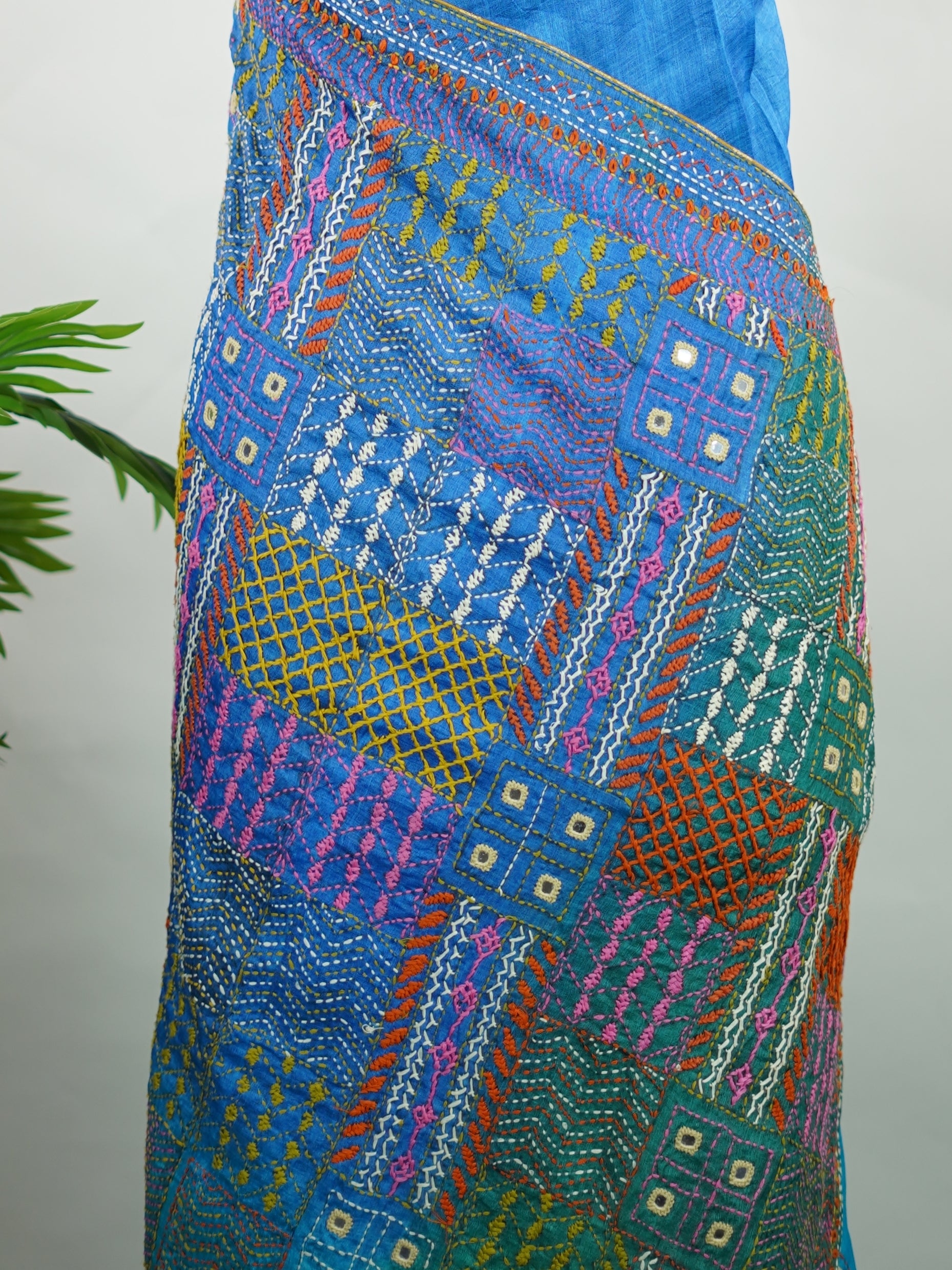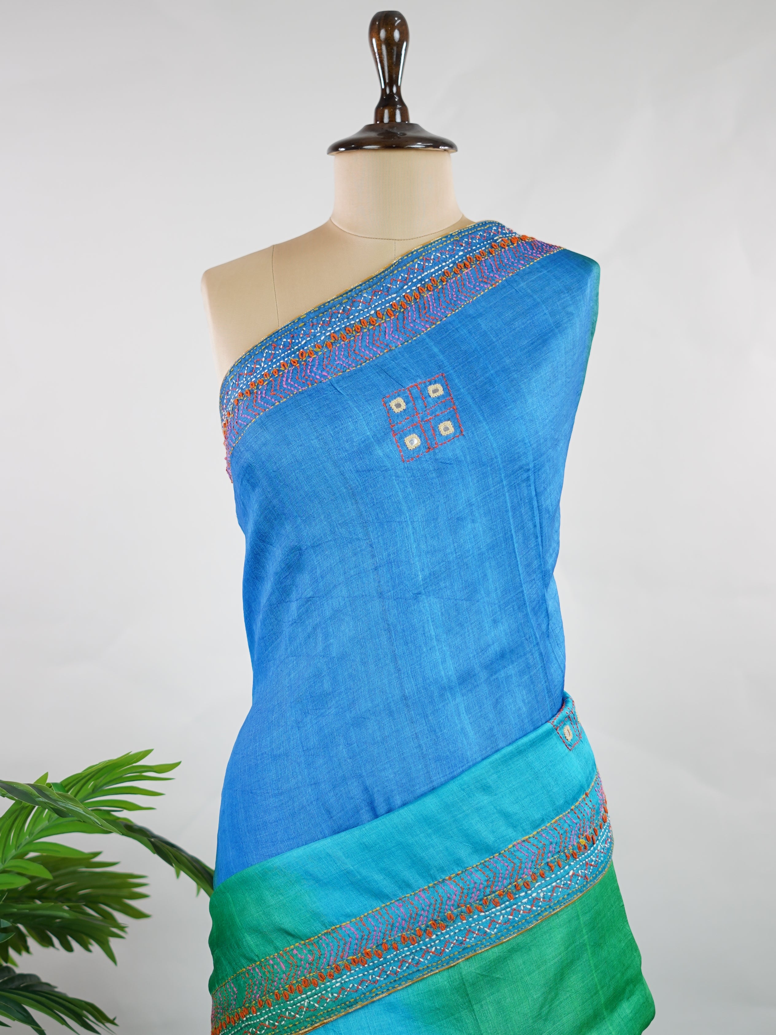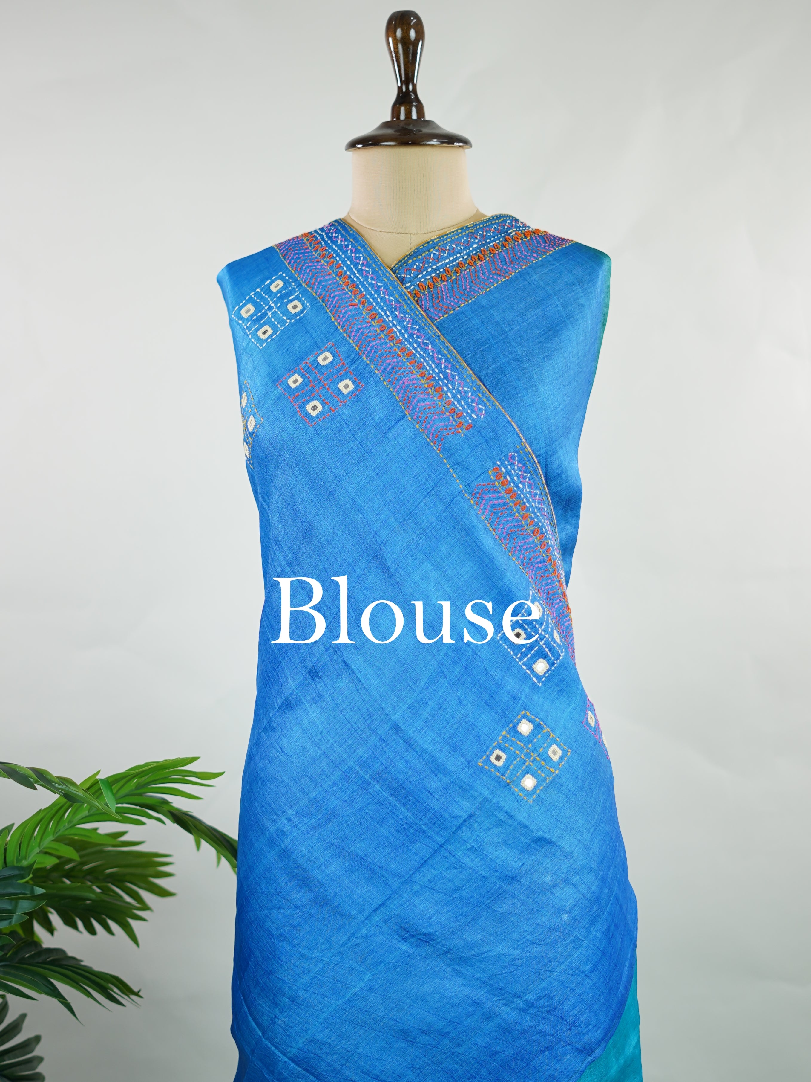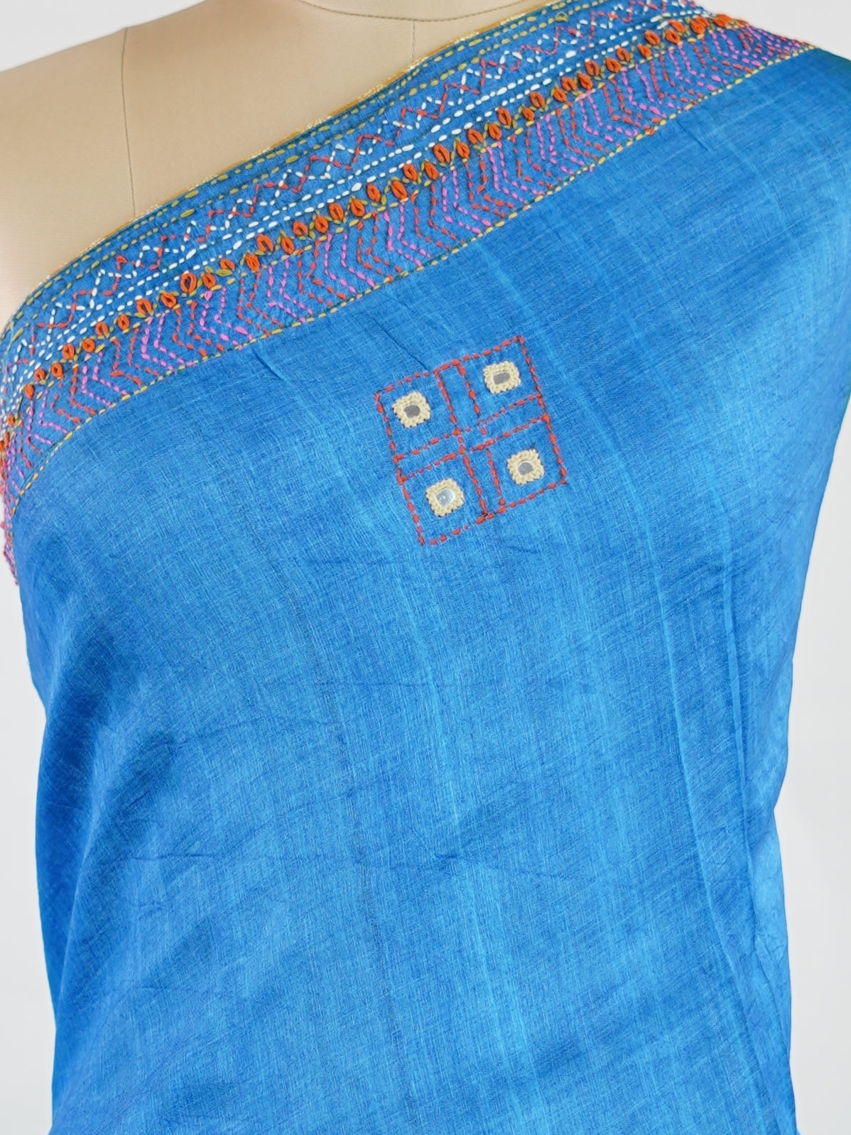 Rich Kutch embroidery beautifully highlights the heavy pallu with vibrant threads, intricate motifs, and signature mirror work, adding grandeur to the natural elegance of Tussar silk.