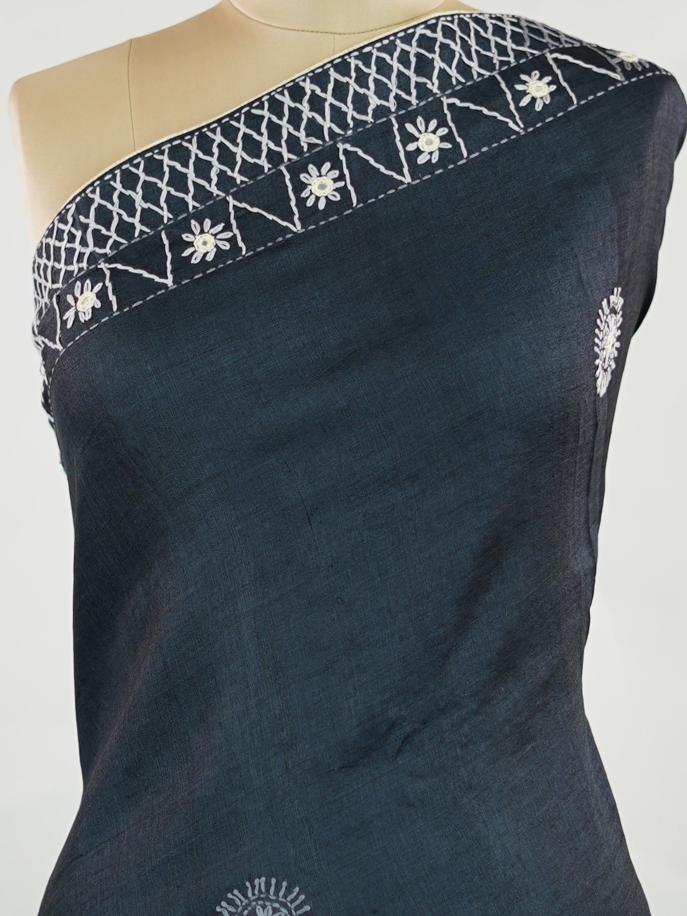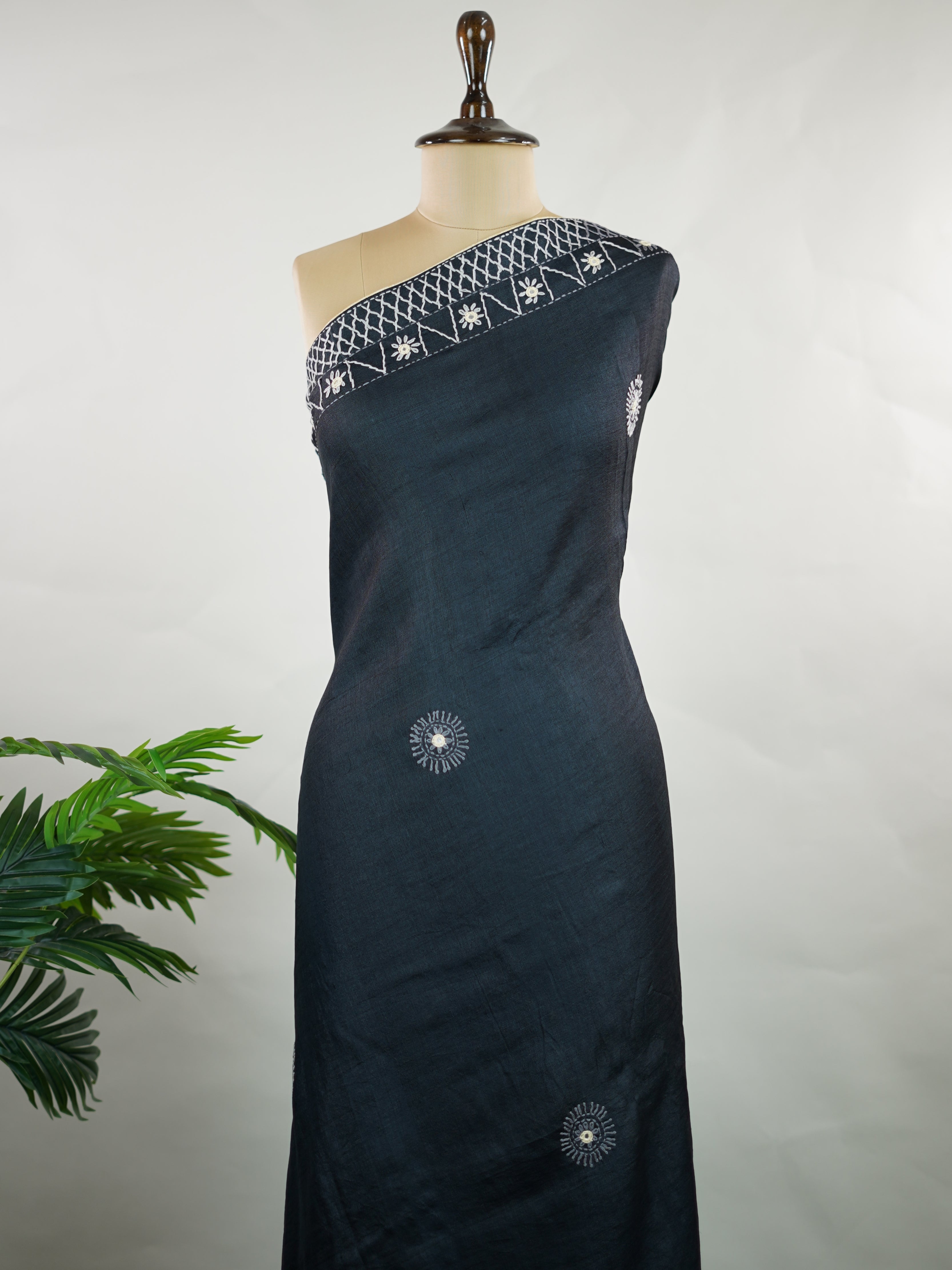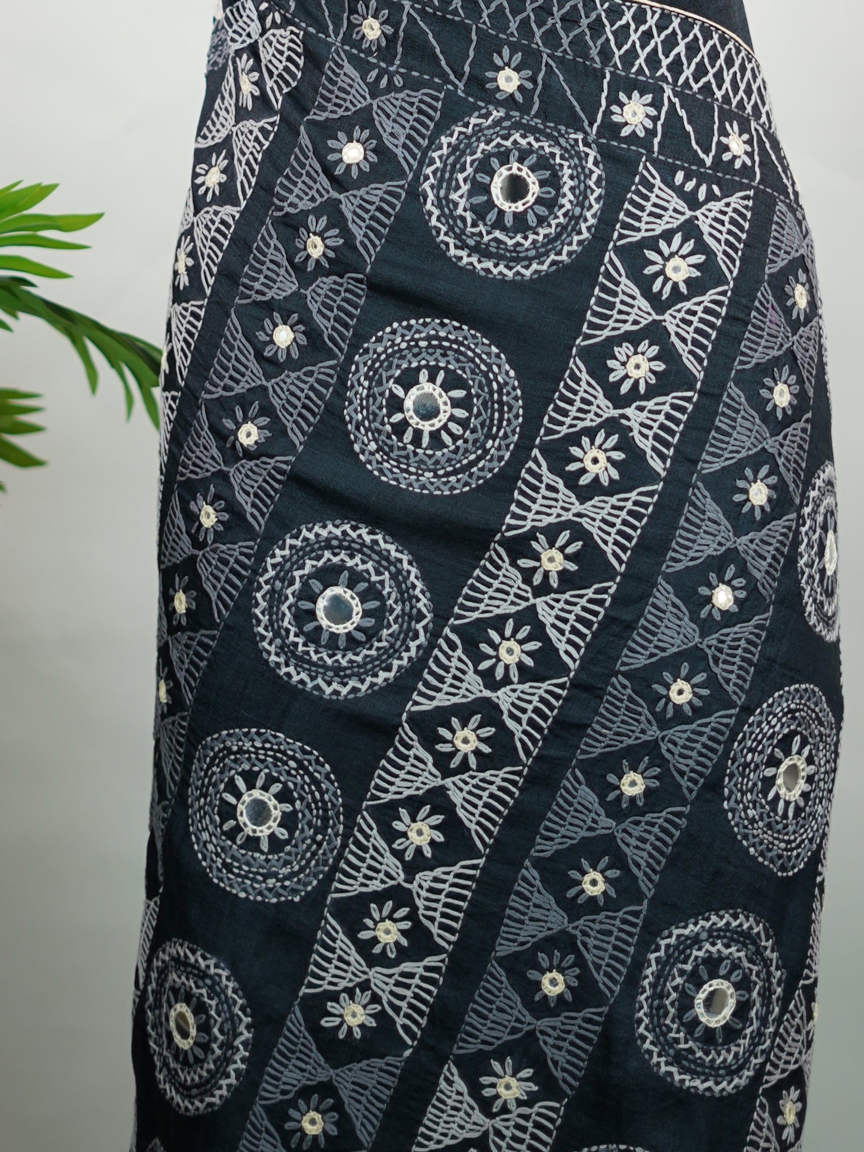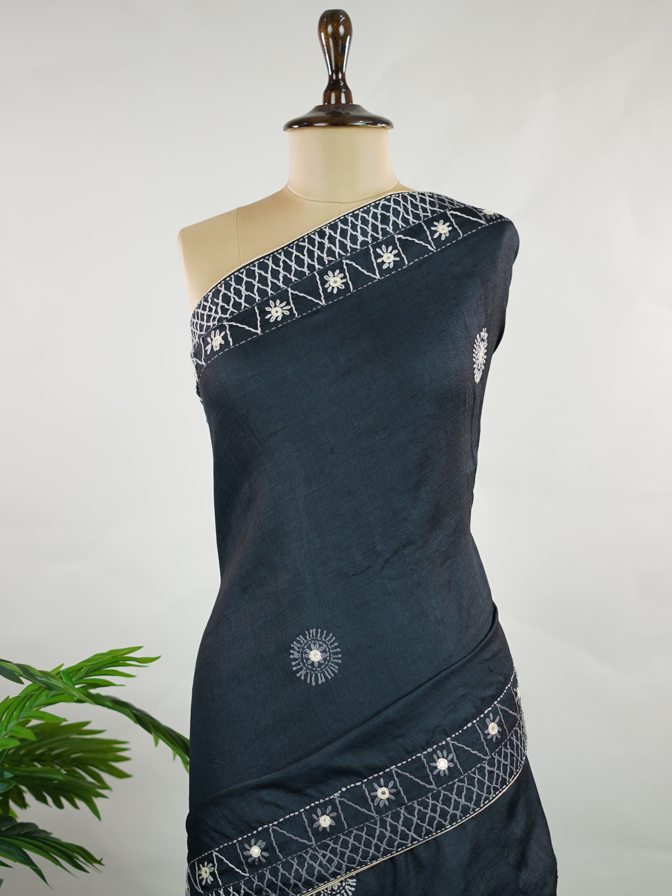 Rich Kutch embroidery beautifully highlights the heavy pallu with vibrant threads, intricate motifs, and signature mirror work, adding grandeur to the natural elegance of Tussar silk.