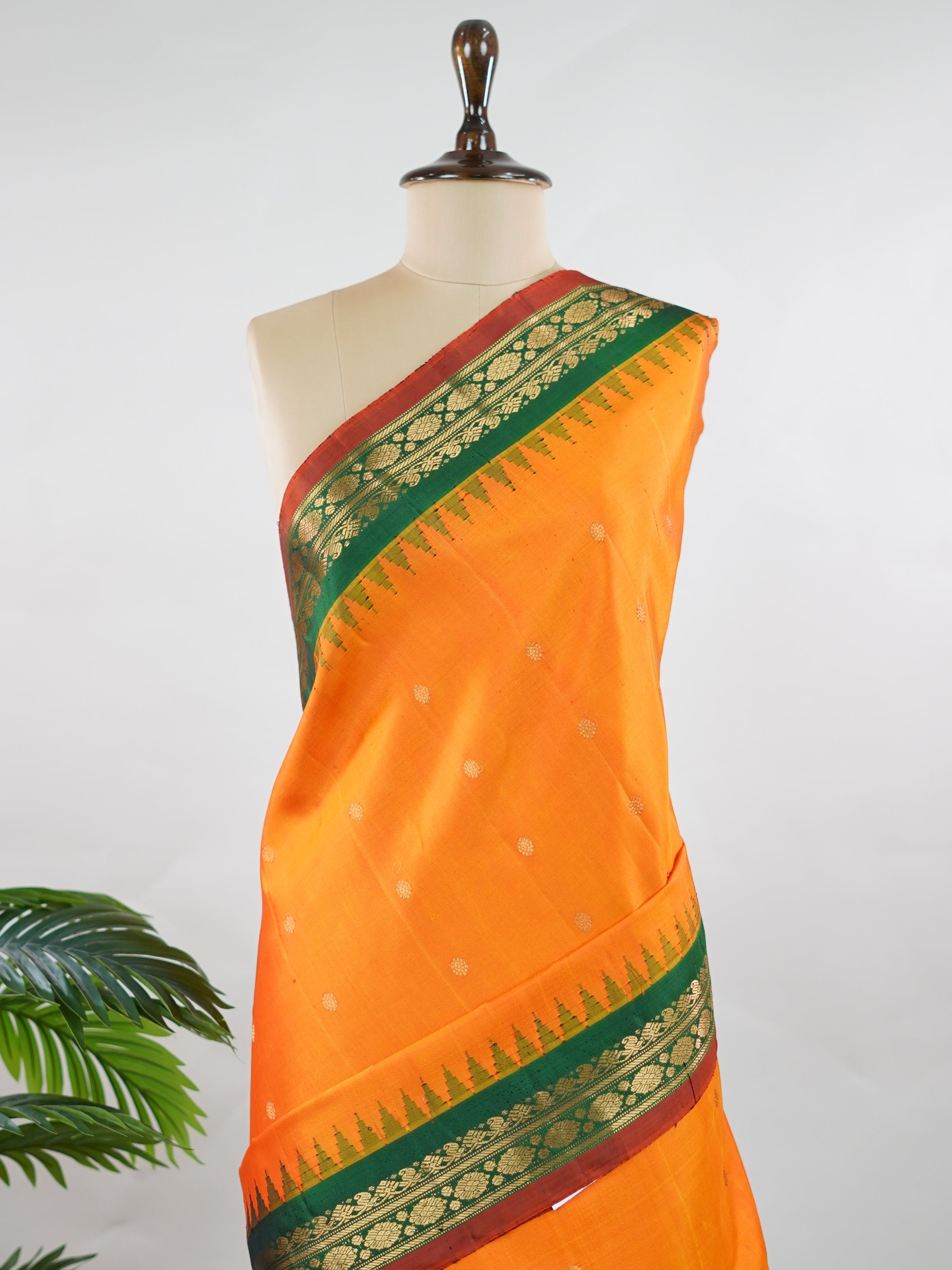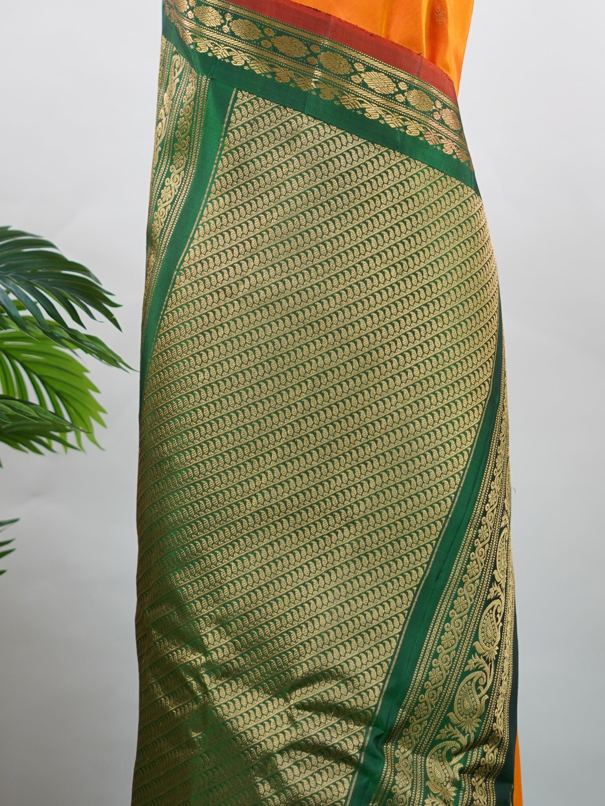 This vibrant Gadwal saree features an orange body paired with a green border, crafted from 100% pure silk.