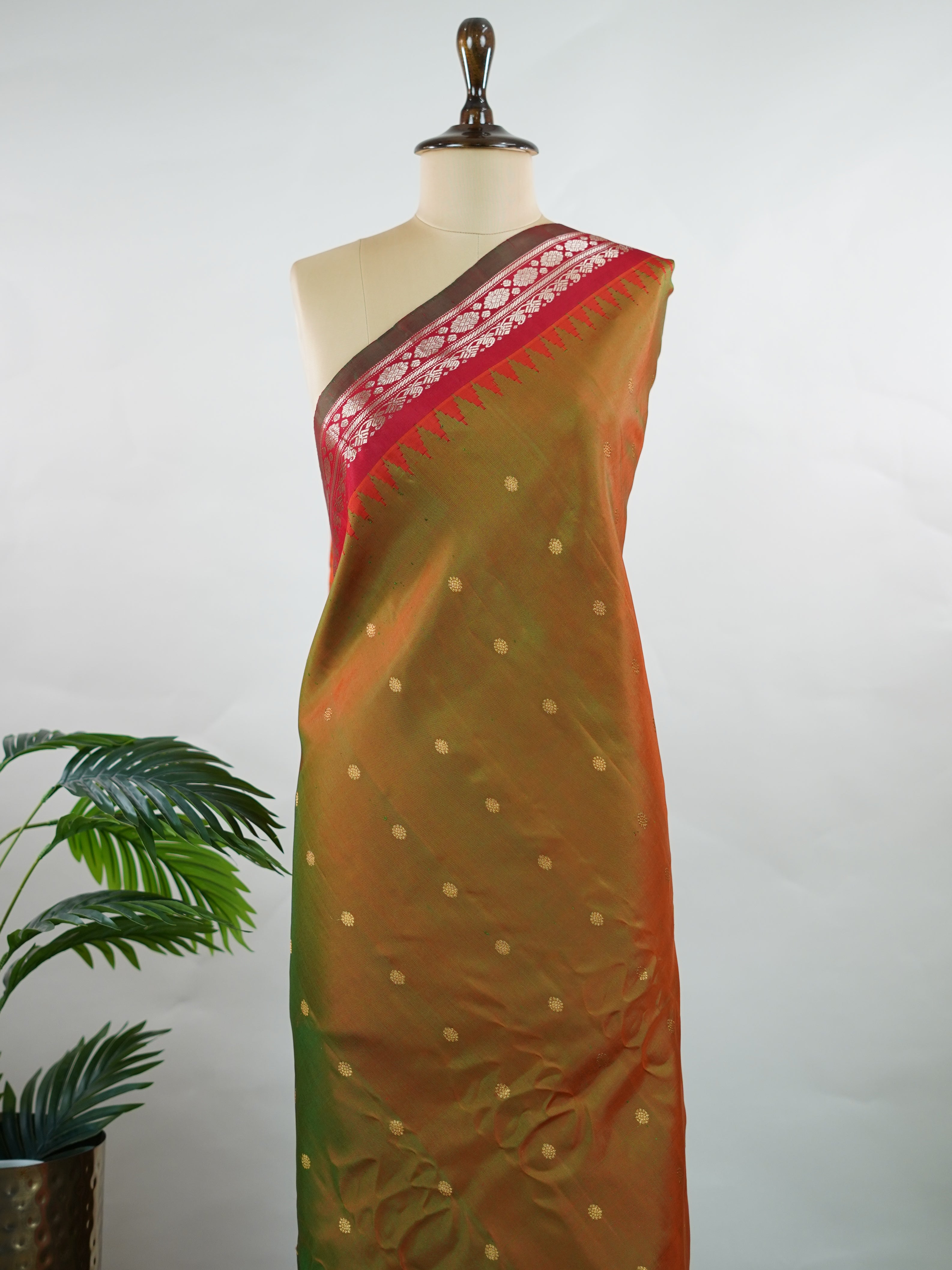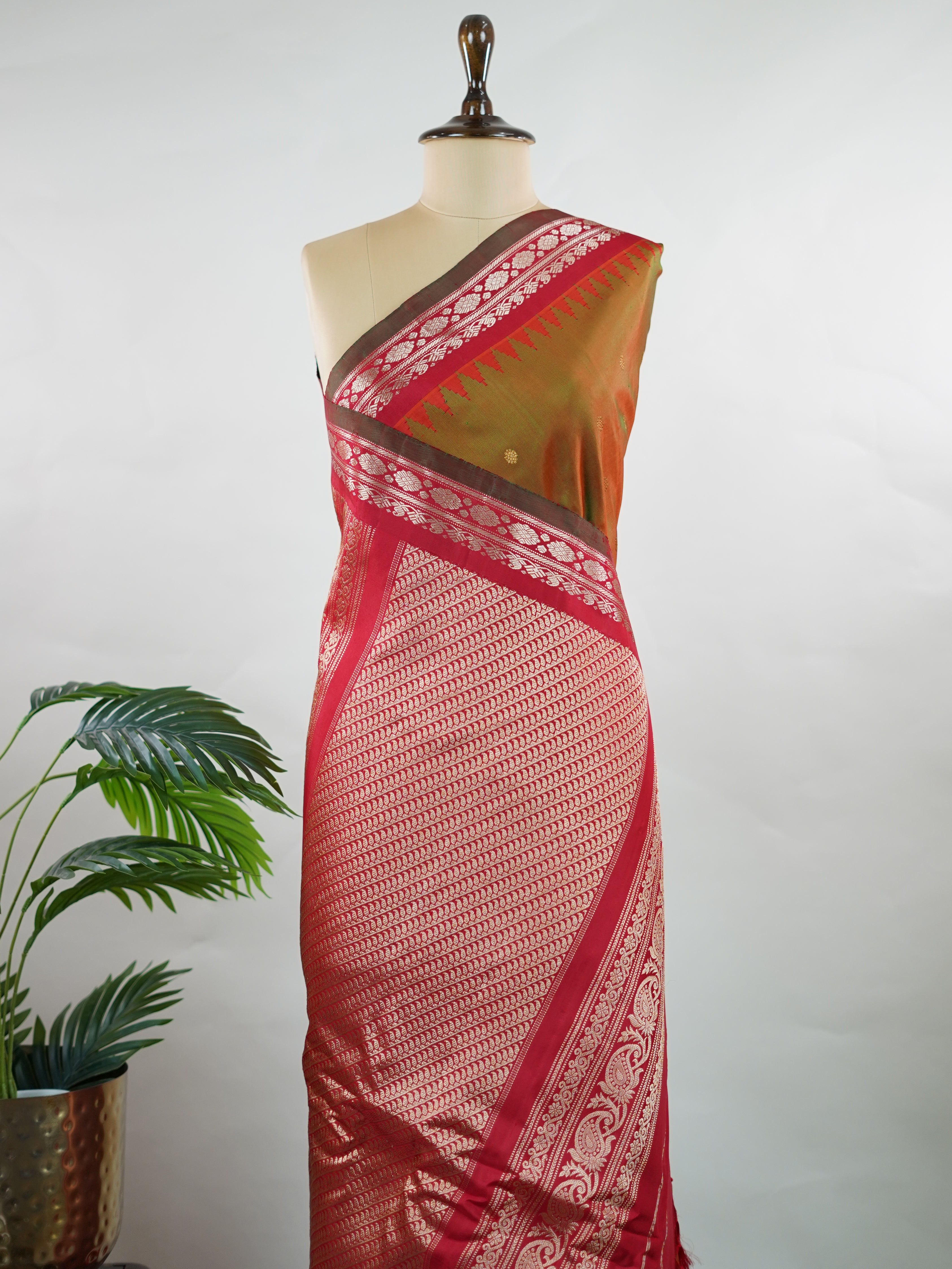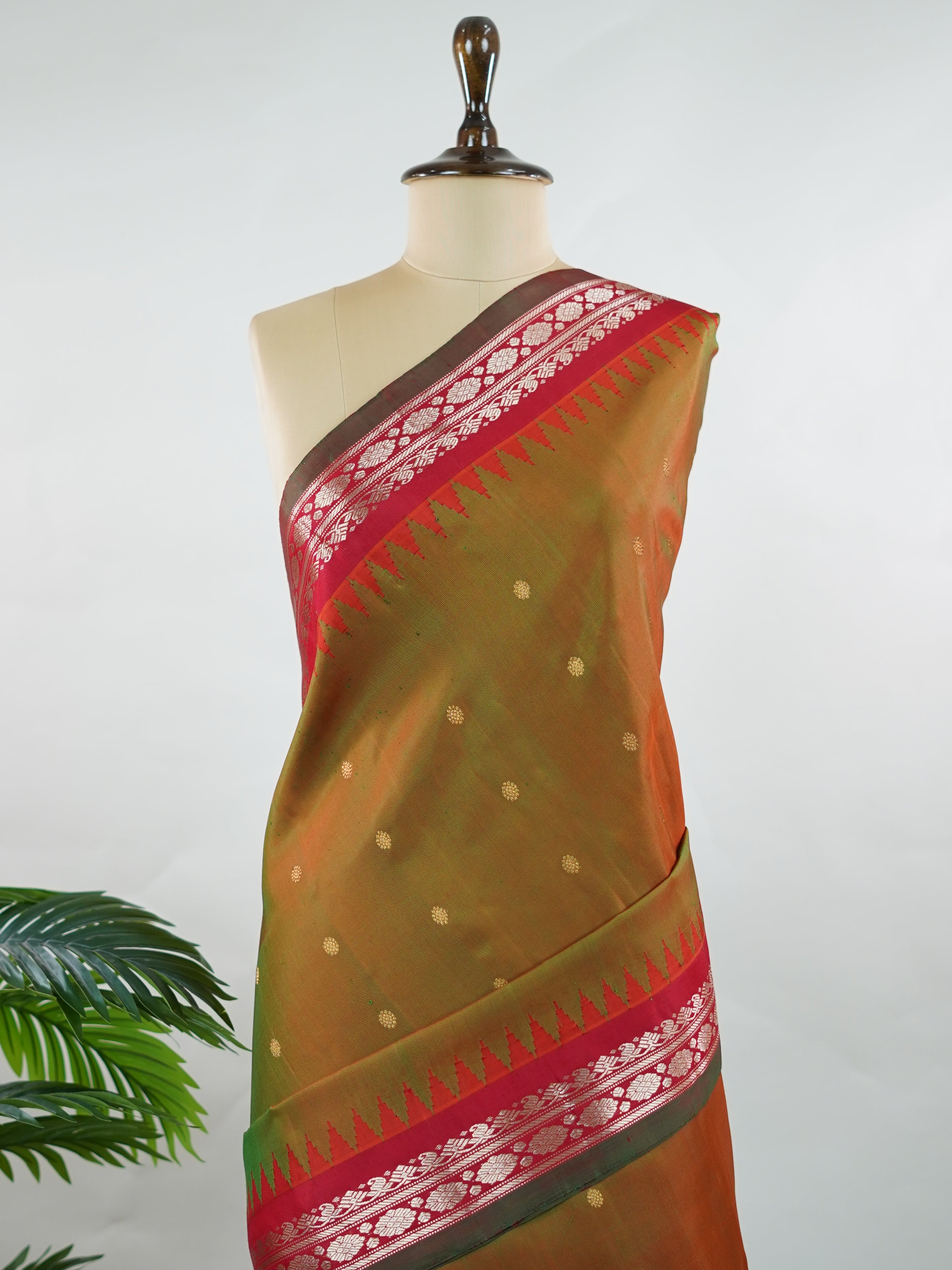 This elegant Gadwal saree features a dual-tone body in olive green and brown, paired with a red border, crafted from 100% pure silk.